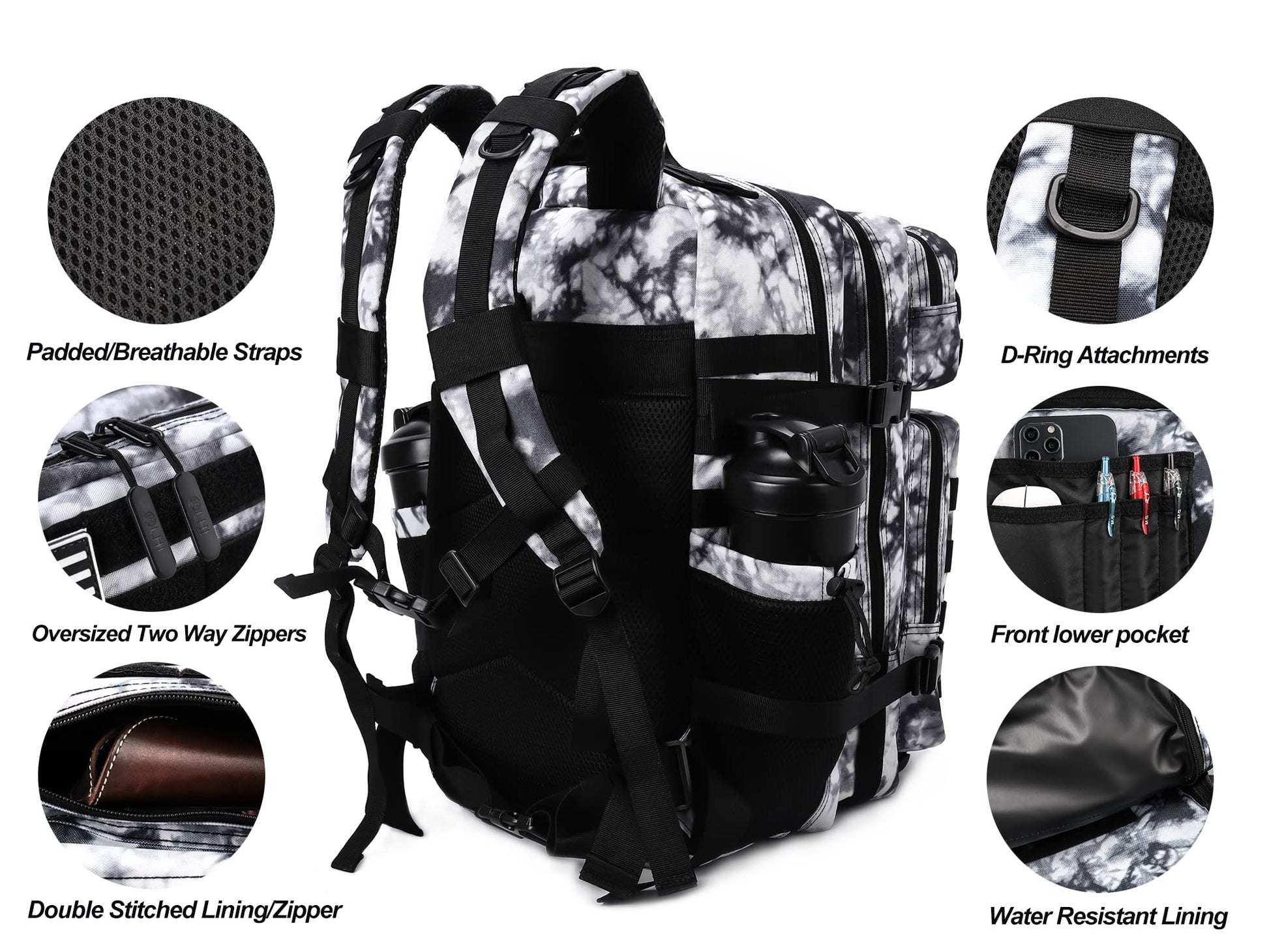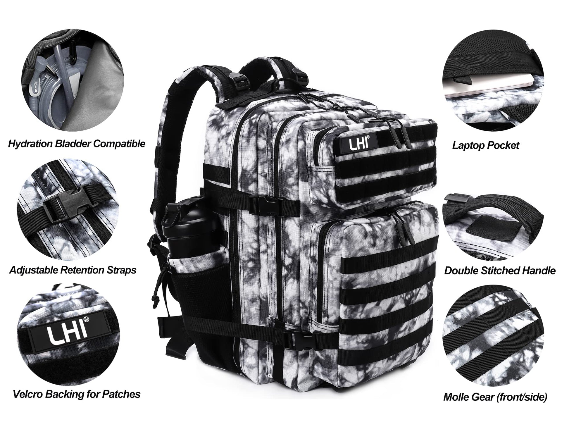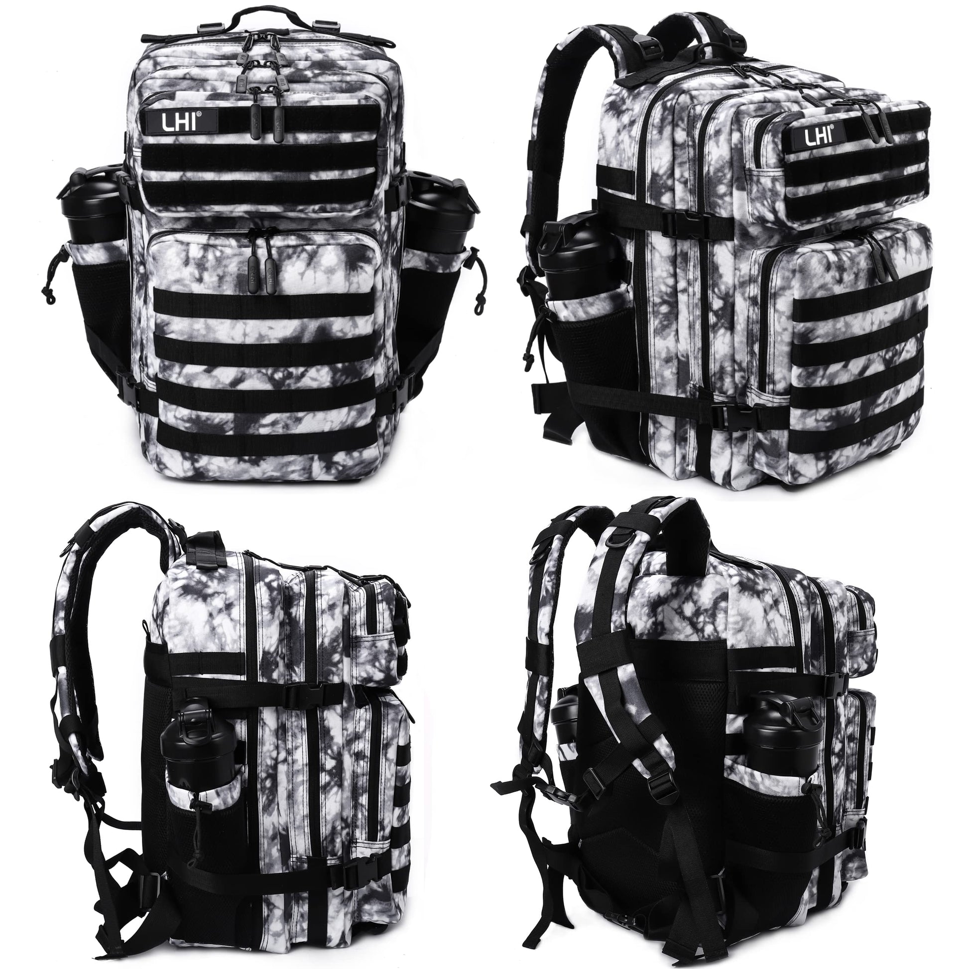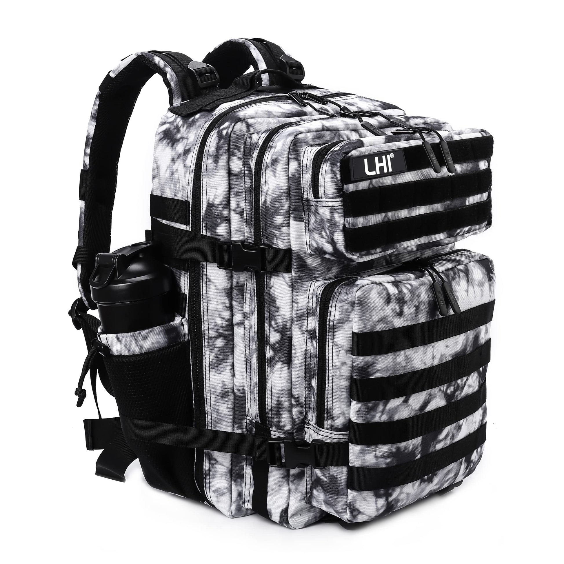 LHI Military Tactical Backpack for Men Molle Daypack 45L Army 3 Days Assault Pack Bag Large Rucksack With Bottle Holder Black and White(12*20*12)