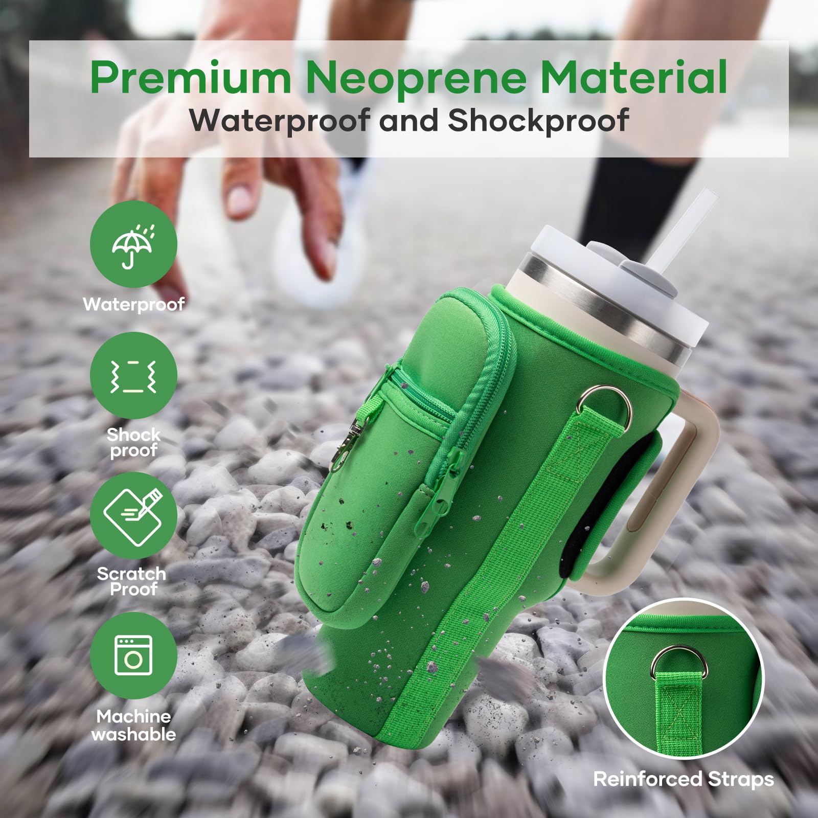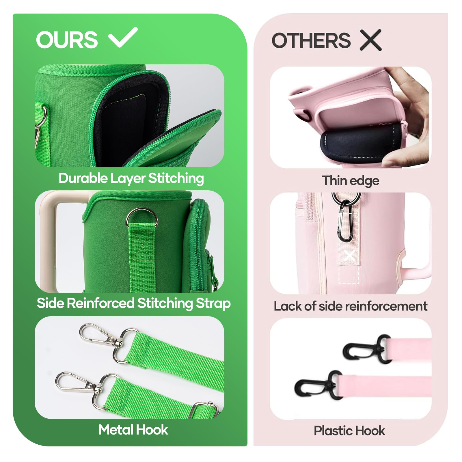 - Premium Neoprene Material & Reinforced Stitching Strap : This Bottle carrier bag for 40/30oz Stanley is made of neoprene material, features soft outer texture, offering excellent waterproofing, shock absorption, softness, protect your Stanley cup from collision, and scratches! Reinforced Stitching Strap will keep the perfect shape of the carrier bag fits your Stanley cup and supports it more durable and stable when you hang out, easier to carry.