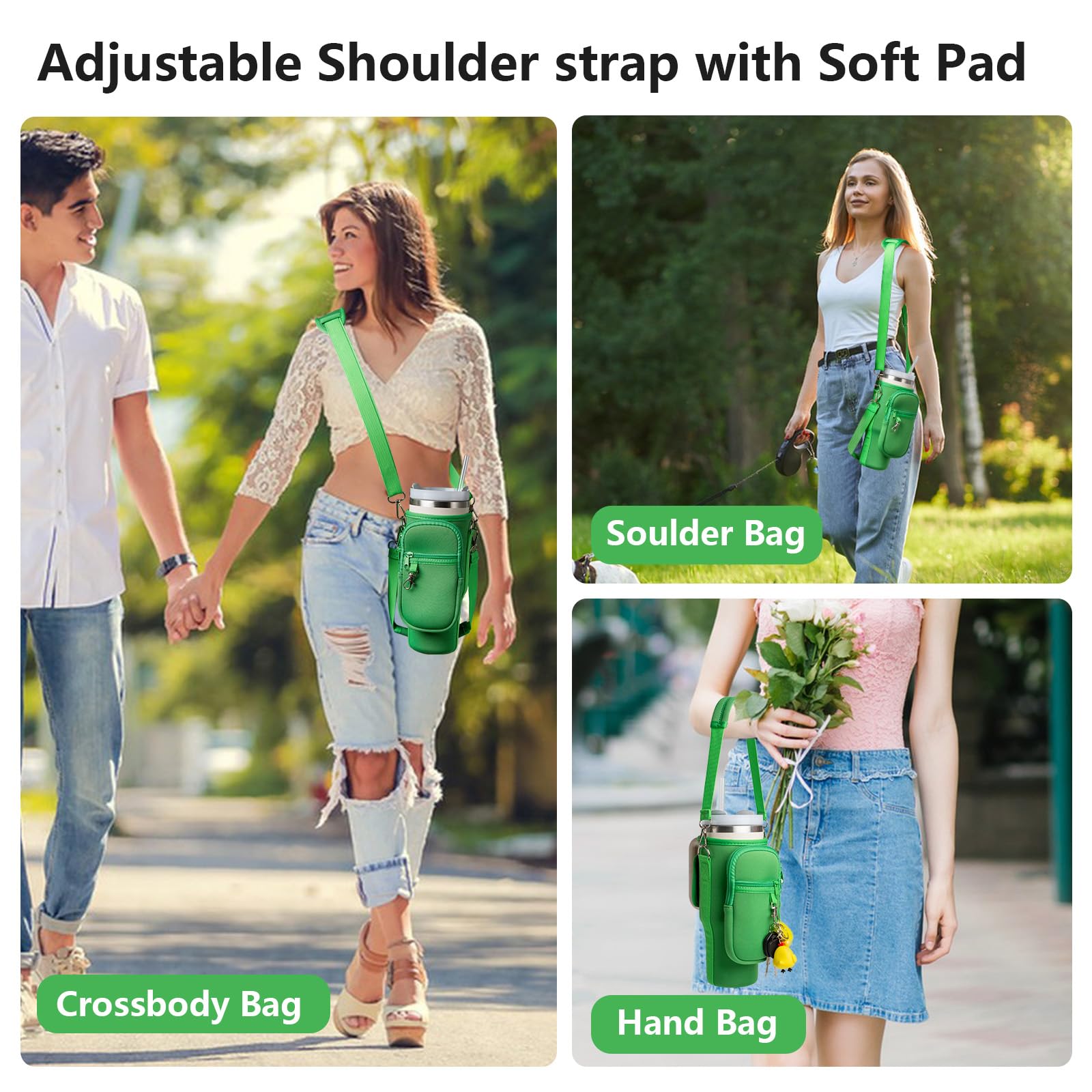 - Adjustable Shoulder Strap and Handle Strap: This Stanley Bottle Carrier Bag comes with 2 different sized straps, One long and adjustable padded shoulder / crossbody strap which make you wear your drink like a purse and a shorter strap for carrying the cup by hand. The shoulder strap can be easily adjusted between 27.5' and 50' to fit a wide range of body shapes,and the clips that hold the straps are metal and sturdy.Ideal Stanley cup accessories.
