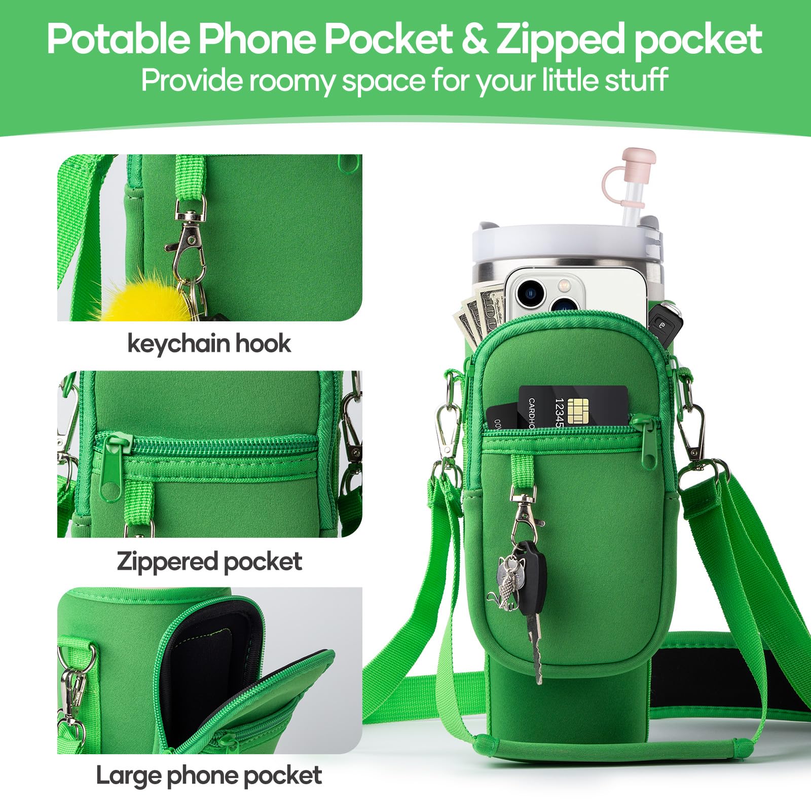 - Multiple Pockets Free Your Hands: The stanley cup holder bag designed with two zippered pocket, including a upgraded phone pocket which could let one hand get the phone in-and-out easier, while another zippered pocket provide enough room for little stuff as cash, ID, credit card, work badge, chapstick, pen, and earbuds in the pockets. The keychain hook for attaching your key and other little accessories. Let's go out with this hands free Stanley Carry All bag.
