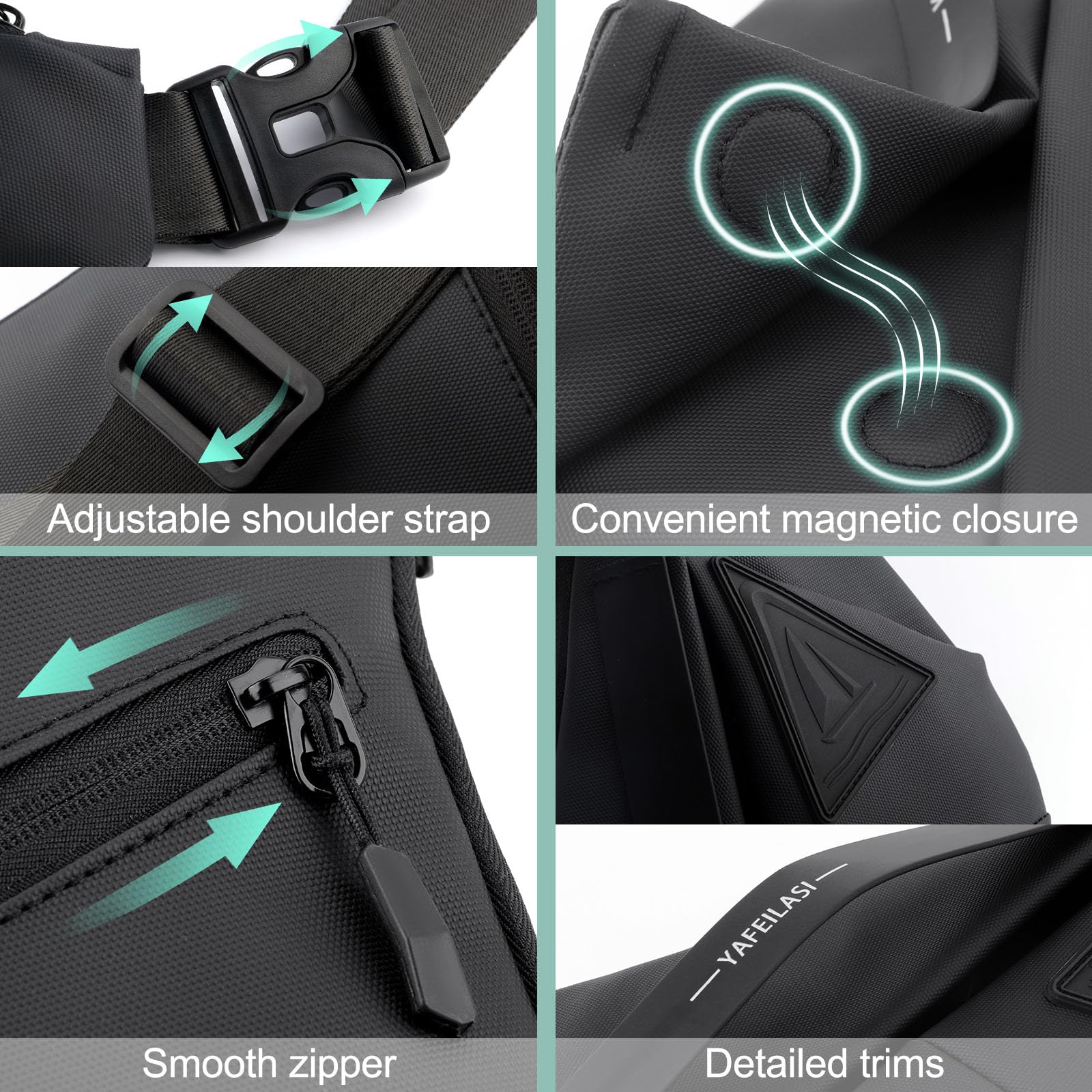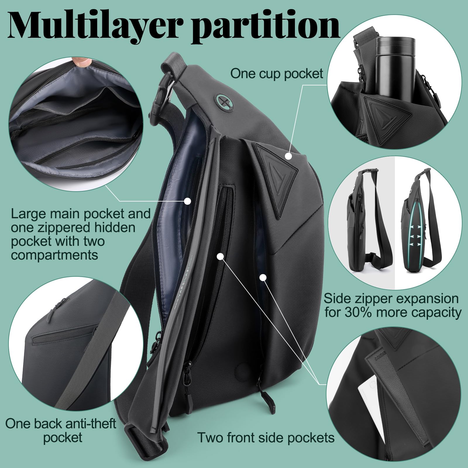 - Multiple Storage Sling Bags:This bag has five zoned pockets, and three internal concealed pockets, the outer pocket can hold chargers, mugs and other frequently used items, the inner pocket can hold wallets cell phones and other valuables, there is an anti-theft pocket on the back of the bag to protect your personal belongings.