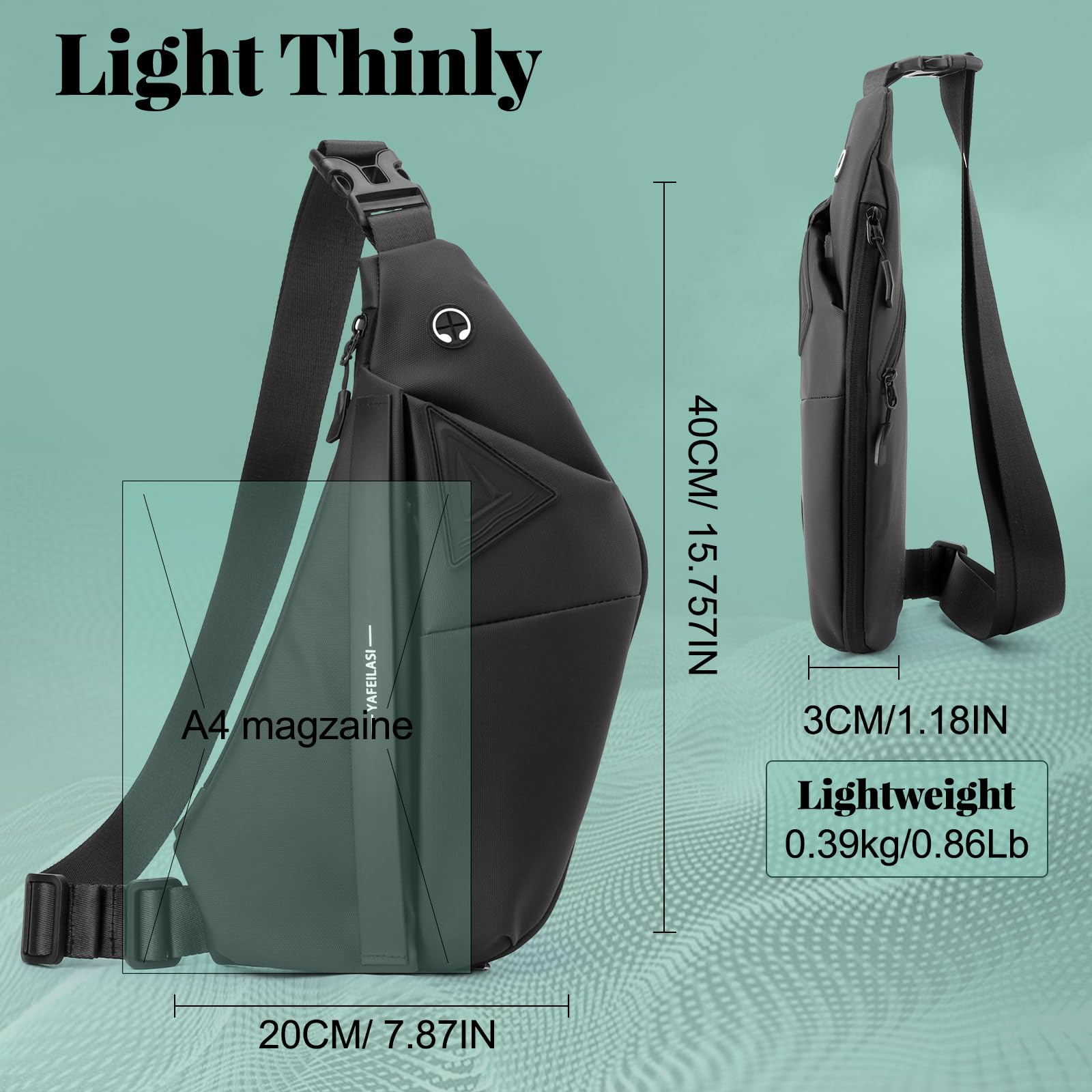 - Lightweight&Large Capacity: The crossbody sling bag weight : 0.39kg, size: 20cm(W)*3cm(D)*40cm(H) (7.87' x 1.18' x 15.75') .Large zipper pocket fits 8.3 inch (about 21.1 cm) mini iPad.Expandable space, anti-theft backpack side zipper expansion design, capacity can be increased by about 30%.