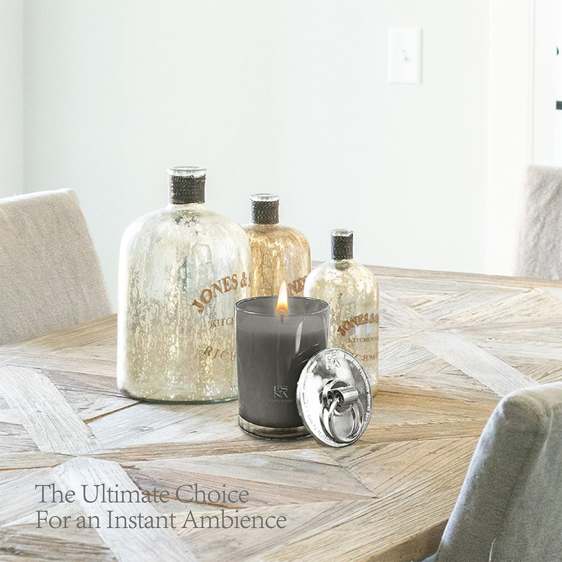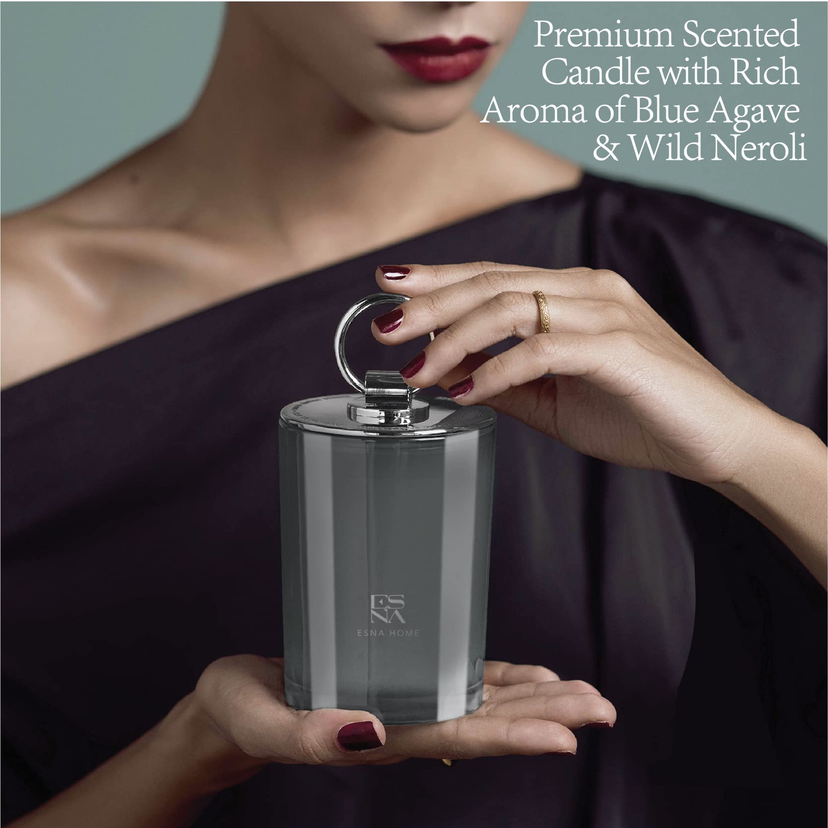- ★ SOPHISTICATED & STYLISH DESIGN - ESNA HOME scented candles are housed in a glass holder and topped with our latest accessory, the ESNA HOME Patented signature platinum coated, engraved metal Snuffer Lid. A beautiful, functional and luxurious piece, designed to fully seal the jar to lock in the fragrance between burning, extinguishing flame neatly and instantly without blown wax or aftersmoke, prolonging the candle burn time & protecting the candle against dust.
