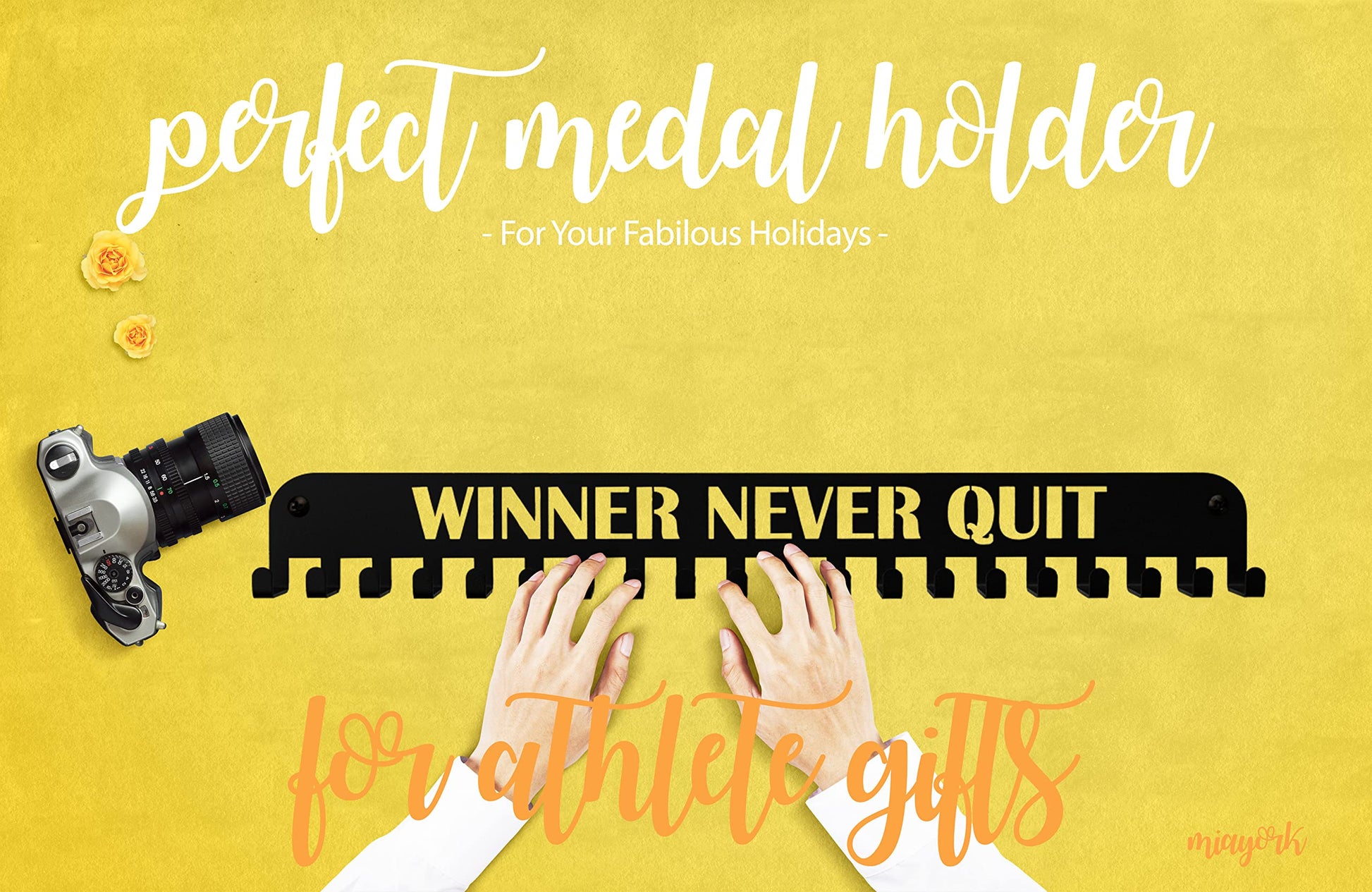 Miayork Medal Holder Display Hanger Race Rack Ribbon Wall Frame with 20 Hanging Hooks Easy Use Easy Install-Run Wrestling Kids Swim Cheer Medal Holder Display Rack in Black Effect-WINNER NEVER QUIT