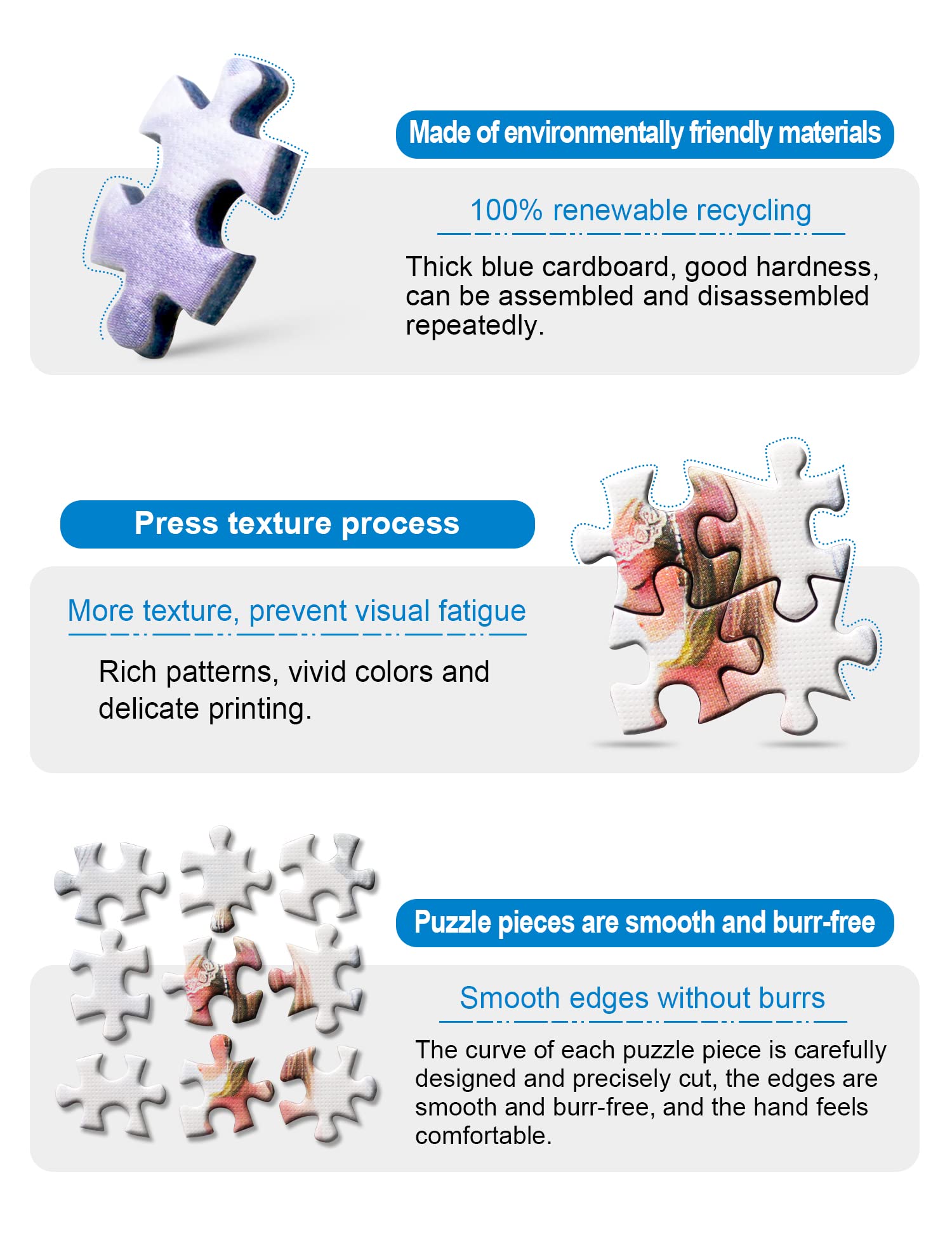 - High Quality Puzzles: small jigsaw puzzles are printed on high quality recyclable blue card stock and non-toxic ink, each piece is made with surface embossed, glare free technology. Compared to other puzzles, LinPuzzle puzzle is the smallest puzzle in the world and very challenging.
