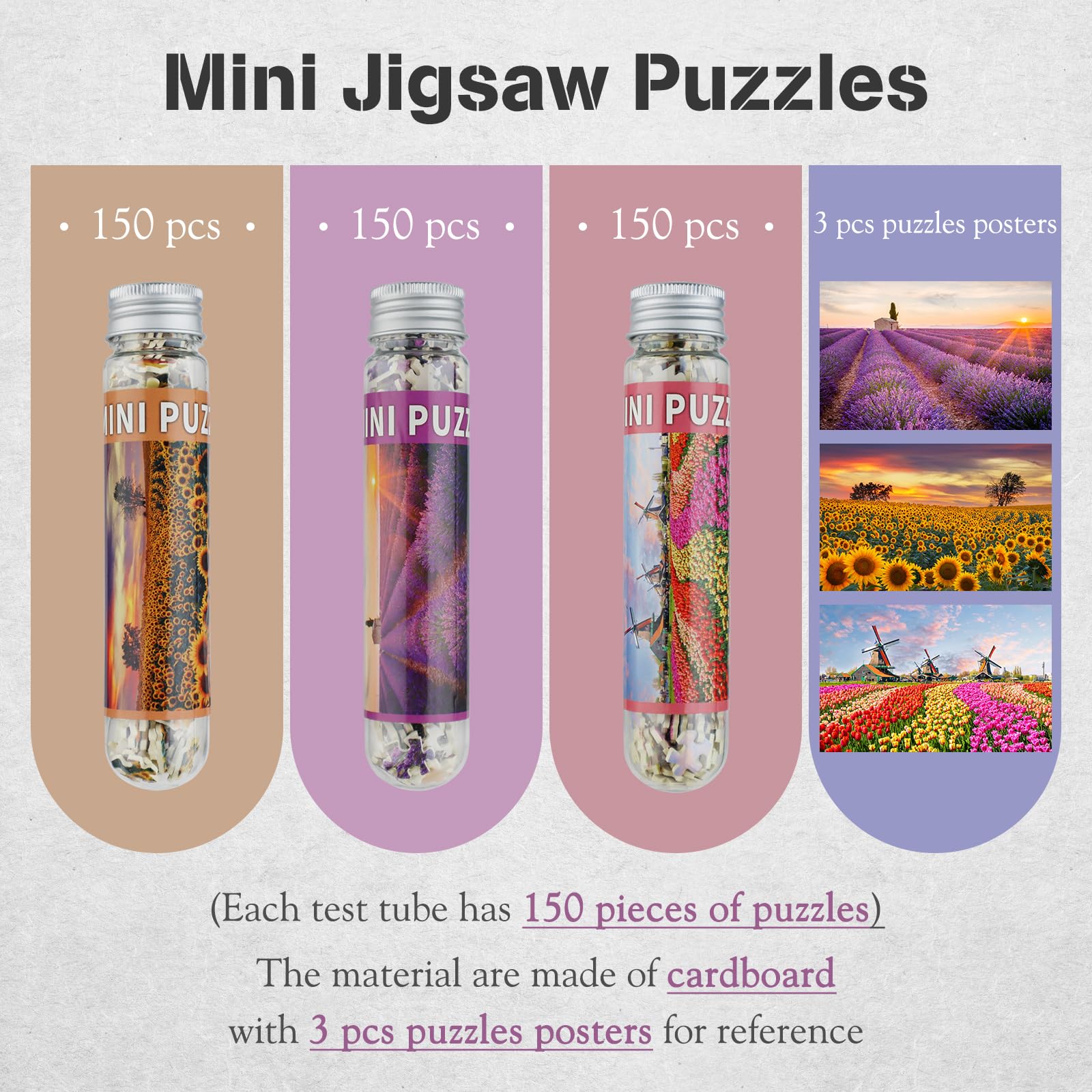 - Jigsaw puzzles 150 pieces -- Puzzles for adults are include 3 pcs separate test tube packaging, each pack contains 150 pieces, a total of 450 pieces. And contain three puzzles poster for reference. Each pieces puzzles smaller than your finger. This set of jigsaw puzzle completed size: 6 x 4 inch /15 x 10 cm (Not including frame).