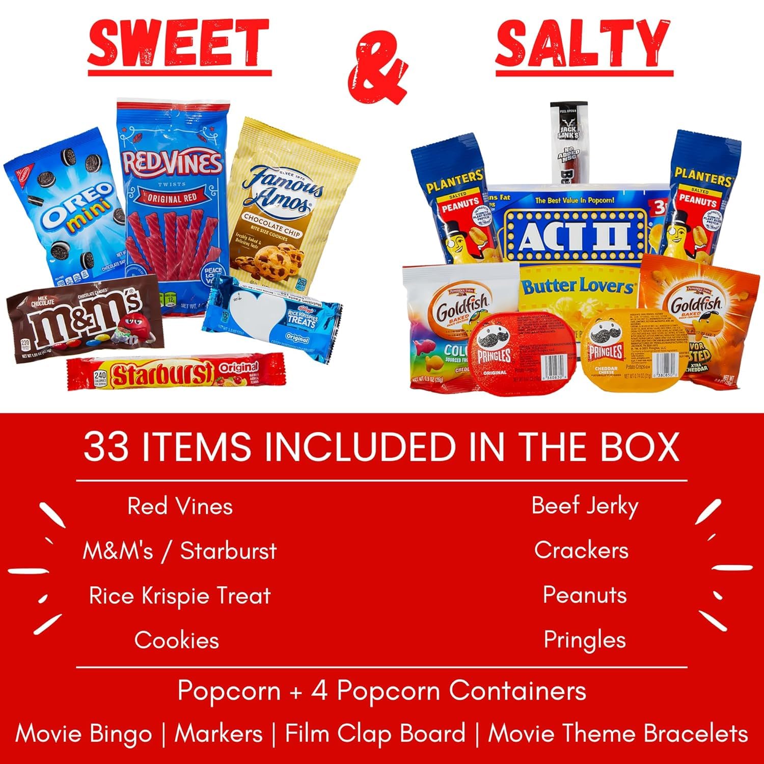 - INCLUDES 33 ITEMS inside our newly designed gift box! All food is well known brand names (3) Packs of Popcorn (4) Food Safe Popcorn Containers, (2) Salted Peanuts (2) Chips, (2) Crackers (1) Beef Jerky Stick, (1) Pack of Licorice Candy, (1) Chocolate Candy, (2) Cookie Packs, (2) Marshmallow Treats. Also includes movie night extras (1) Director Clapboard, (4) Movie Night Bracelets, (4) Erasable Pens and (4) Movie Night Bingo Game Cards for extra fun!