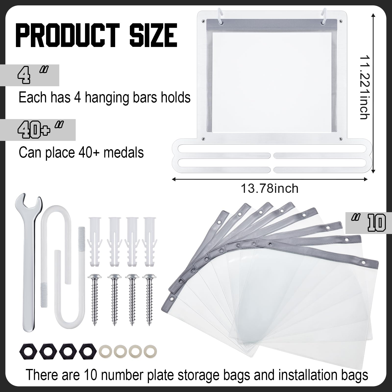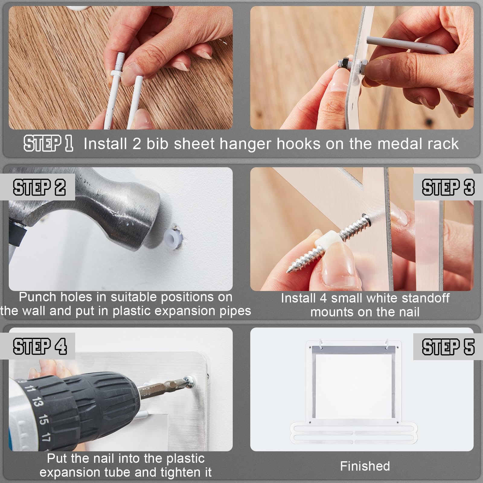 - Convenient to install: the race medal display rack is designed for wall mounting to maximize space and keep your medals and bibs organized, the package comes with the appropriate mounting kit, you simply attach the rack and screws to the wall, then place the medals in the plastic bibs and hang them on the hooks, slide your medals onto the bars