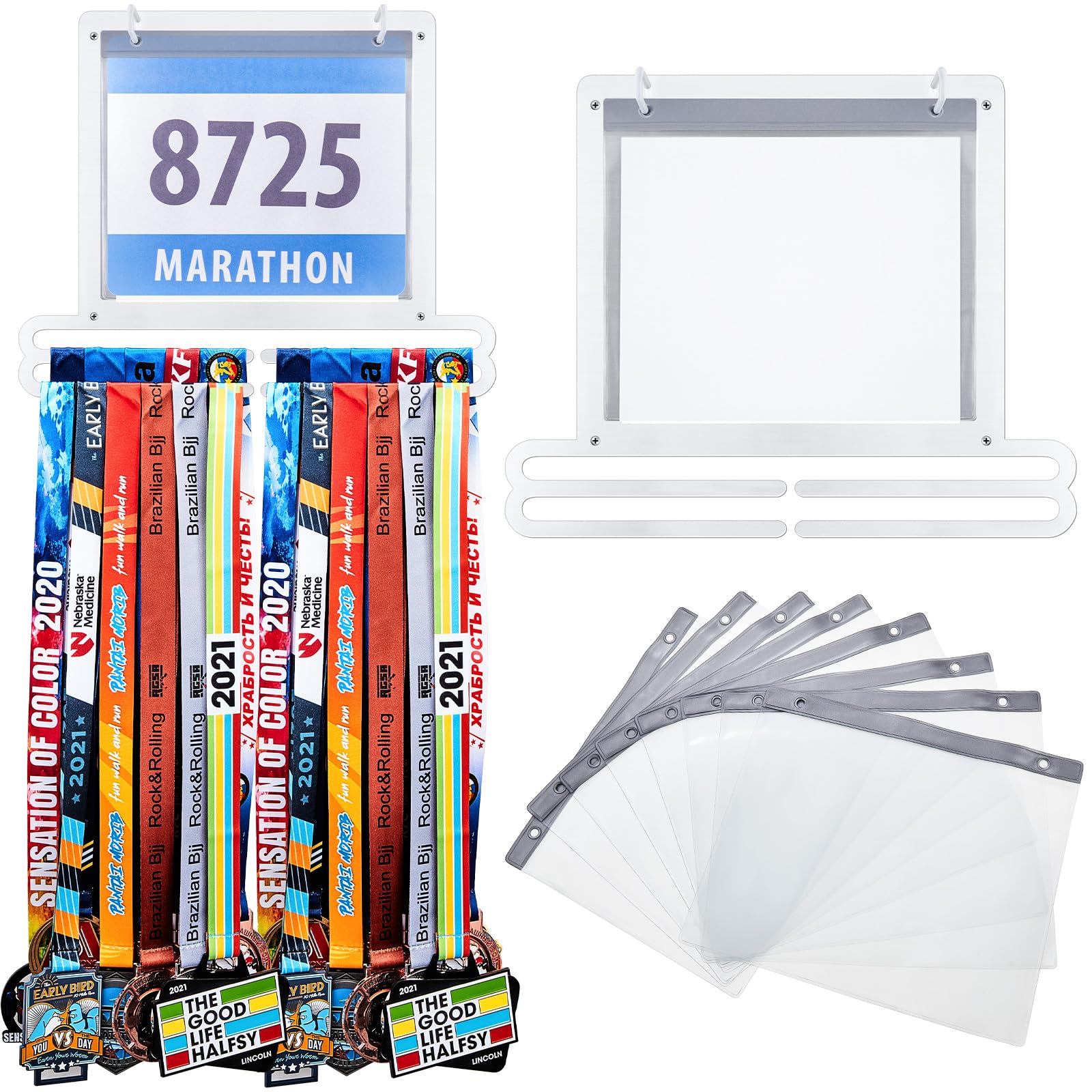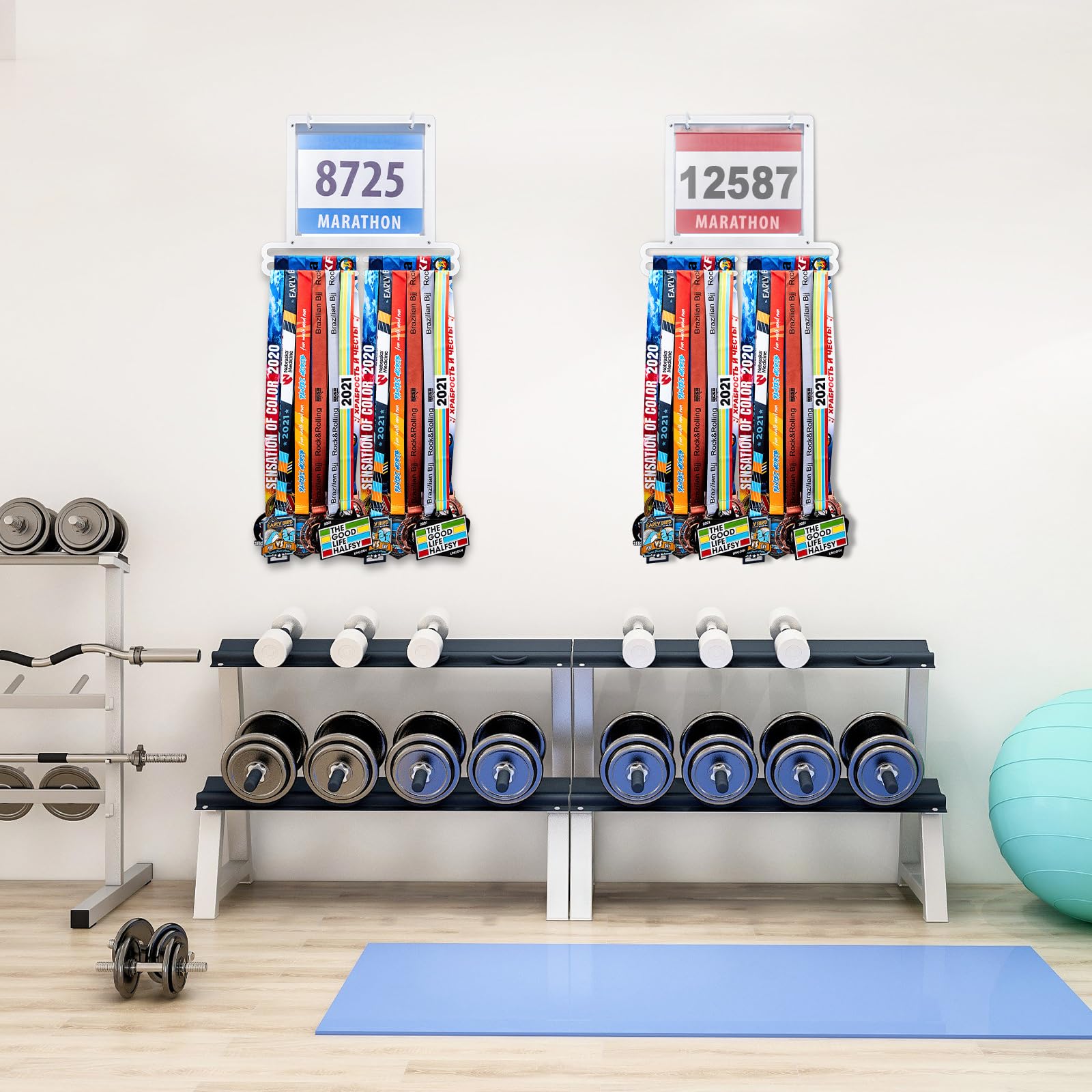 - Long lasting to use: made of reliable metal that won't bend or break easily over time, the race bib and medal display is a must-have for most athletes; Multiple hooks hold your race bibs above the hanging medals, and the plastic bib holders are simple to open and close, making it easy for you to use