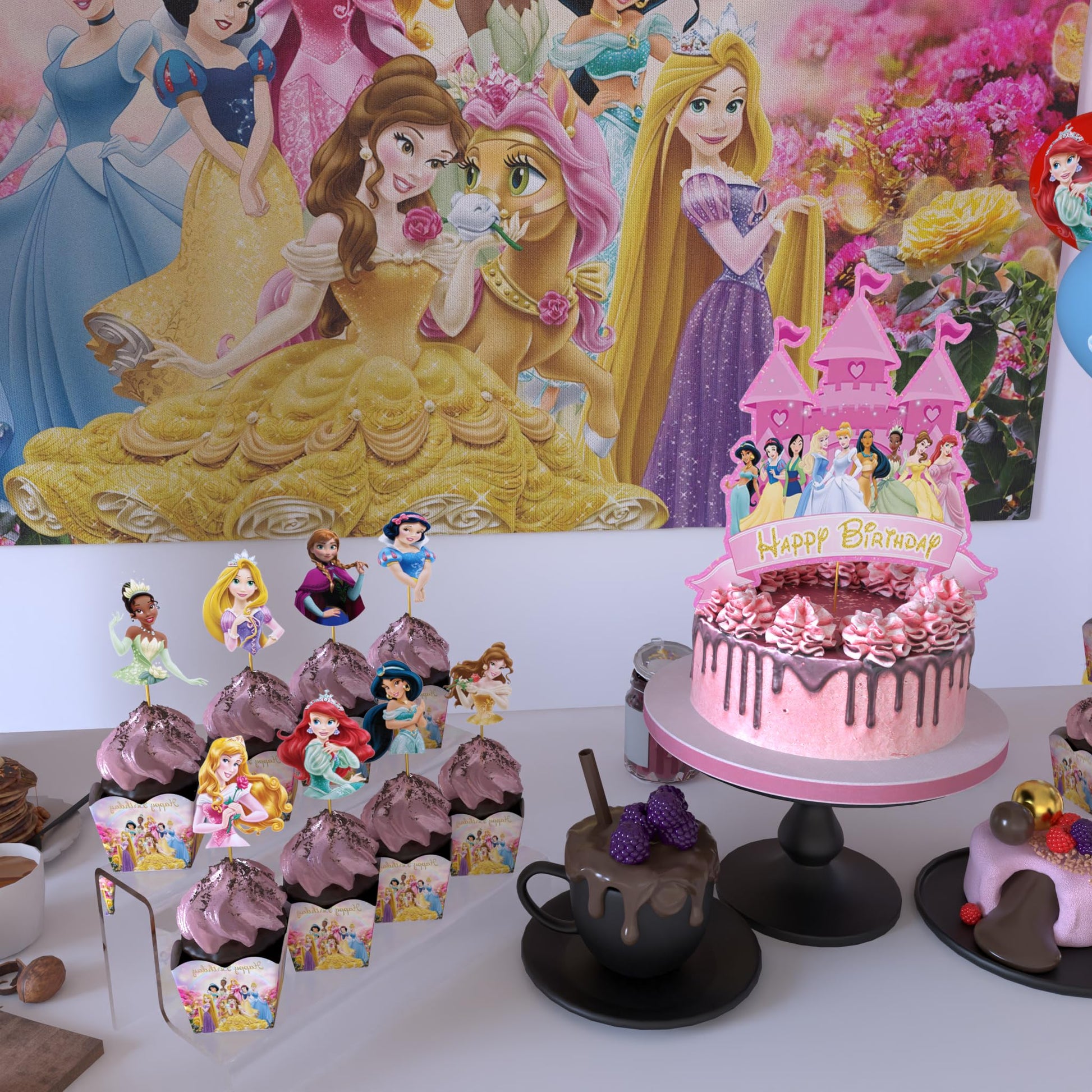 Nelton Party Supplies For Princess Includes Cake Topper, 24 Cupcake Toppers, 20 Latex Balloons, Happy Birthday Backdrop, 1 Table Cloth , 1 Banner