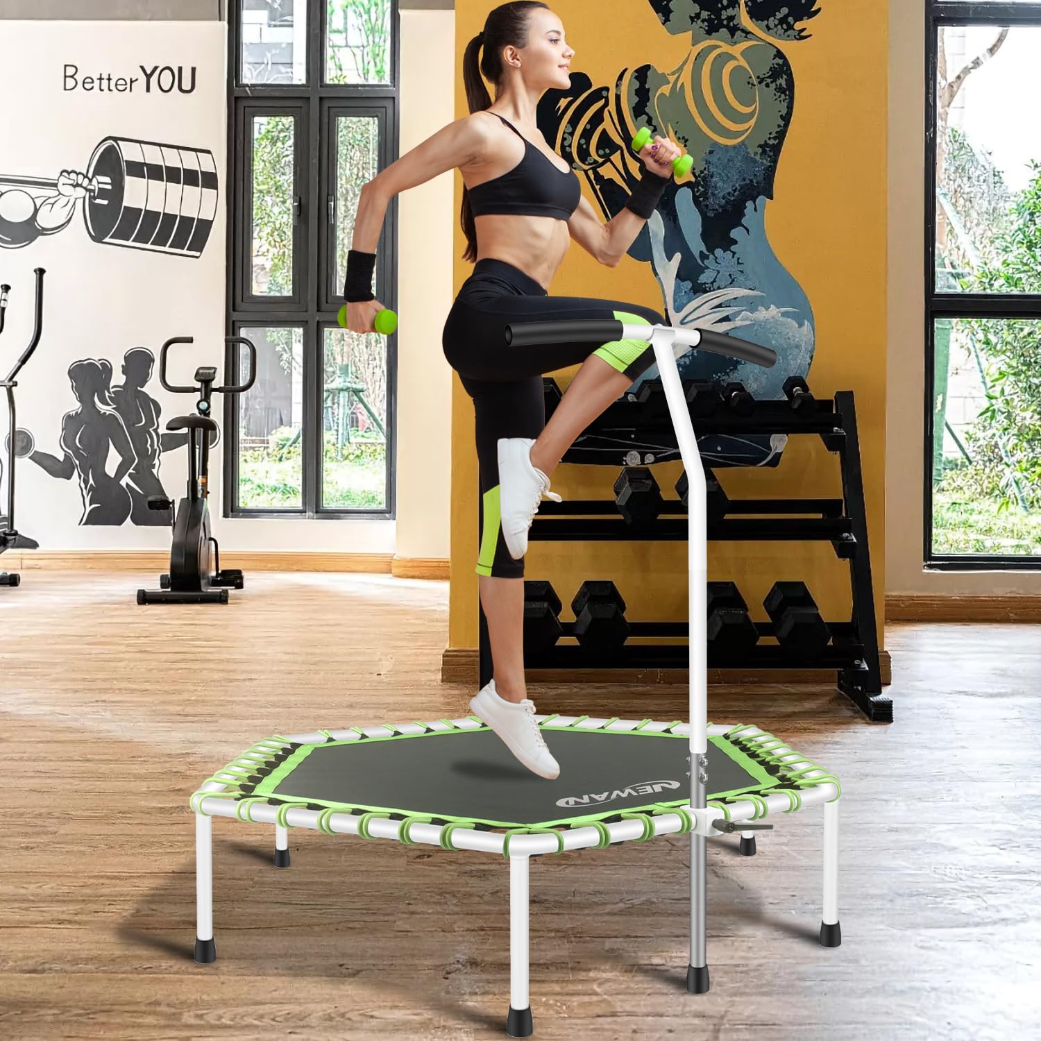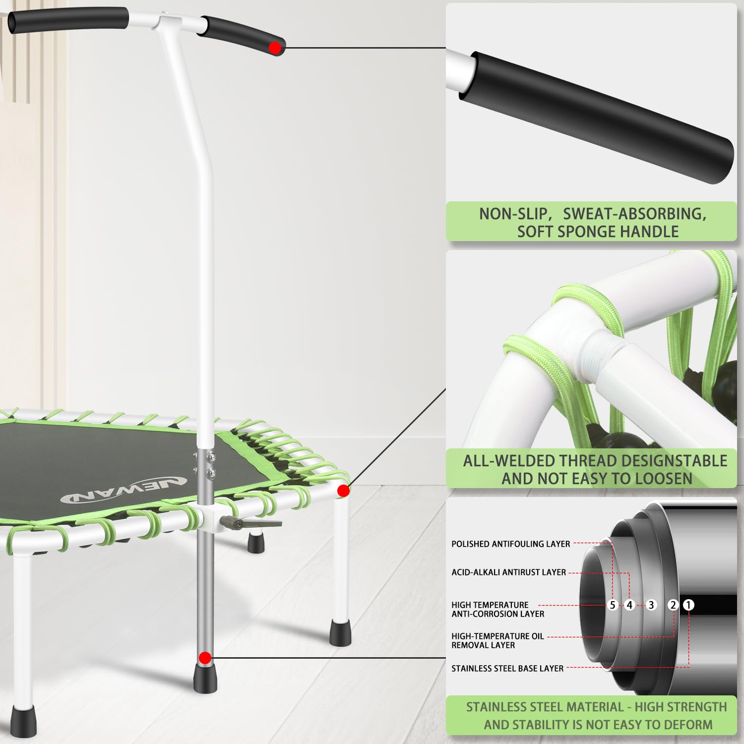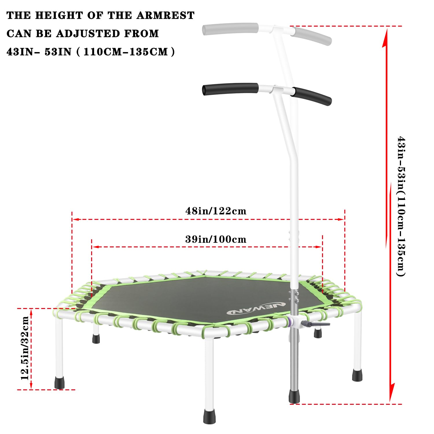 - ✅【Newly Upgraded Handrail】After many tests NEWAN Trampoline perfectly integrates the handrail with stainless steel to make it more stable and solid.The height of the armrest can be adjusted at any height within the 43in-53in (110CM-135CM) range, it can be at any height you want.