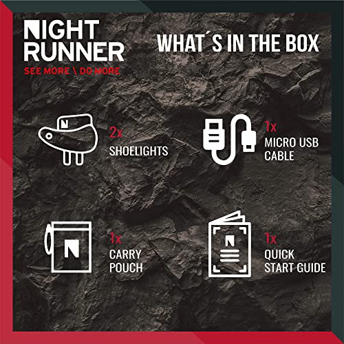 Details: HANDS FREE / HEAD FREE LIGHTING The first product of its kind, Night Runner shoe lights help you stay active past sundown by offering unrivaled visibility, comfort, and safety in low-light environments. Whether you're hitting the city run trails or pounding the pavement, Night Runner's 150 lumen LEDs help you stride confidently by illuminating the path up to 30 feet ahead of you. Plus, back-facing red tail lights alert motorists of your location.