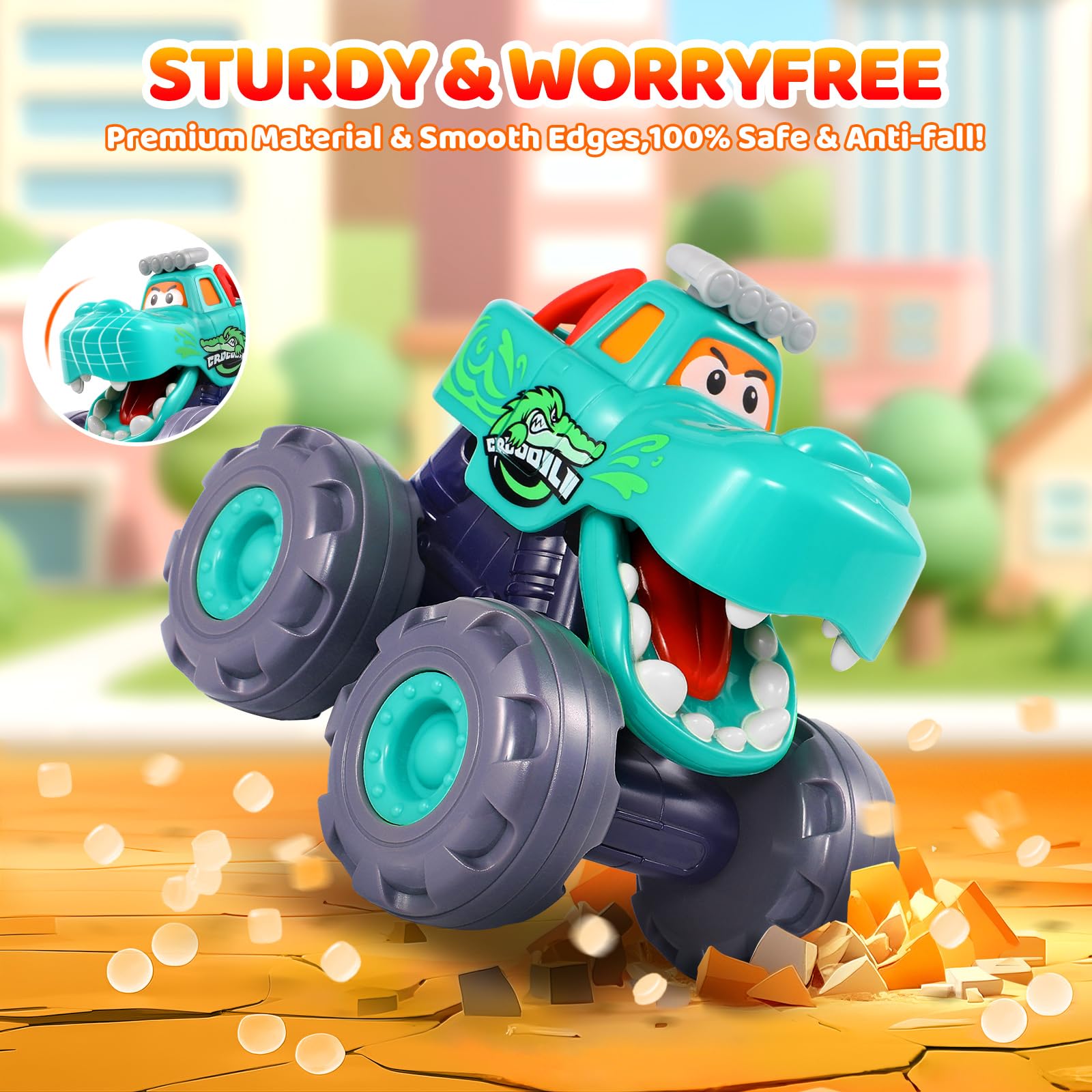 - ENJOY ENDLESS FUN: Awesome car toys for toddlers 1-3, cool monster shape, bright colors and super big wheels, so easy to catch your kids' eyes. Press toy trucks' top button to open mouth and see teeth, definitely impress your little one. Your littles will completely obsessed with interesting toddler car, why not have hours of fun playing with your sweeties?