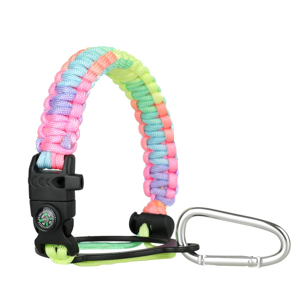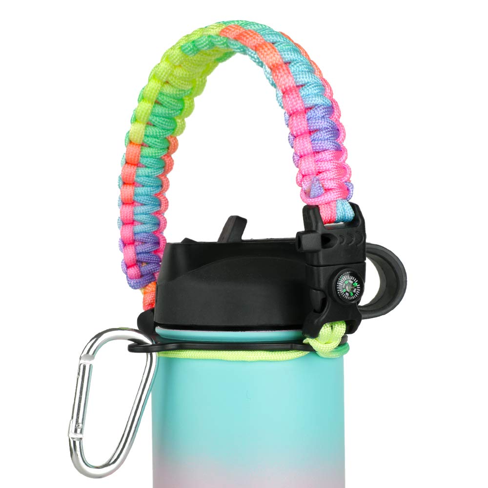 Paracord Handle - Fits Wide Mouth Bottles 12oz to 64oz - Durable Carrier, Paracord Carrier Strap Cord with Safety Ring,Compass and Carabiner - Ideal Water Bottle Handle Strap (Rainbow)