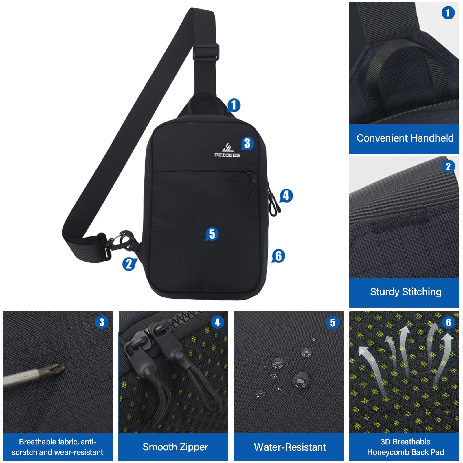 - Back - The three-dimensional honeycomb back cushion of the small sling bag promotes free air circulation, keeps your back constantly dry and relieves back pressure. Multi-layer honeycomb mesh elastic foam back cushion, made of a combination of three layers of different materials, with breathable shock-absorbing effect, so that you can experience a comfortable back.