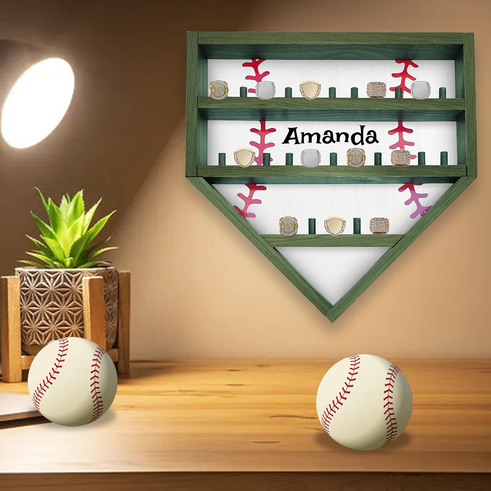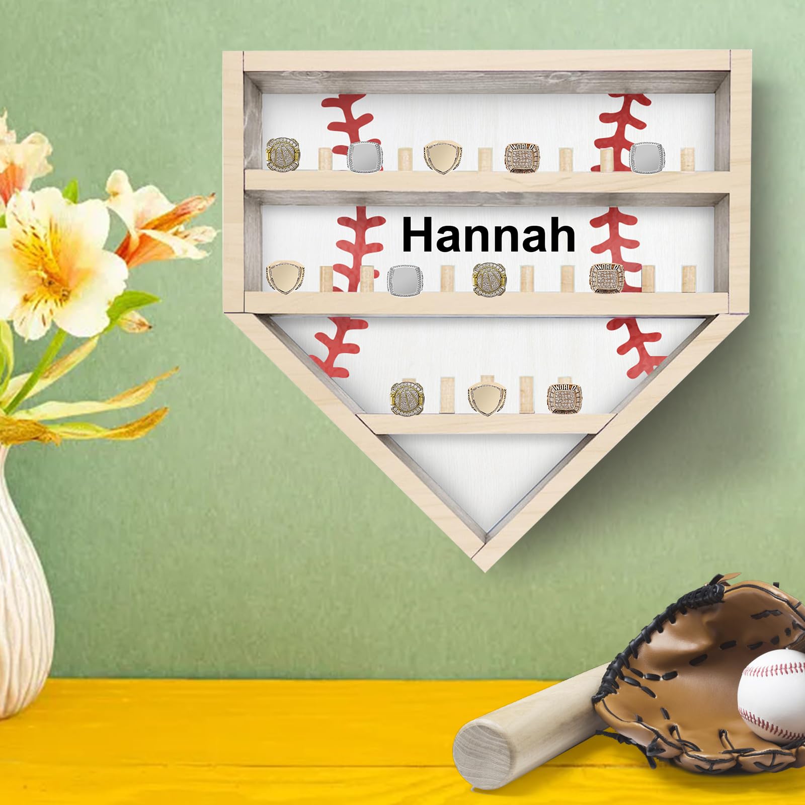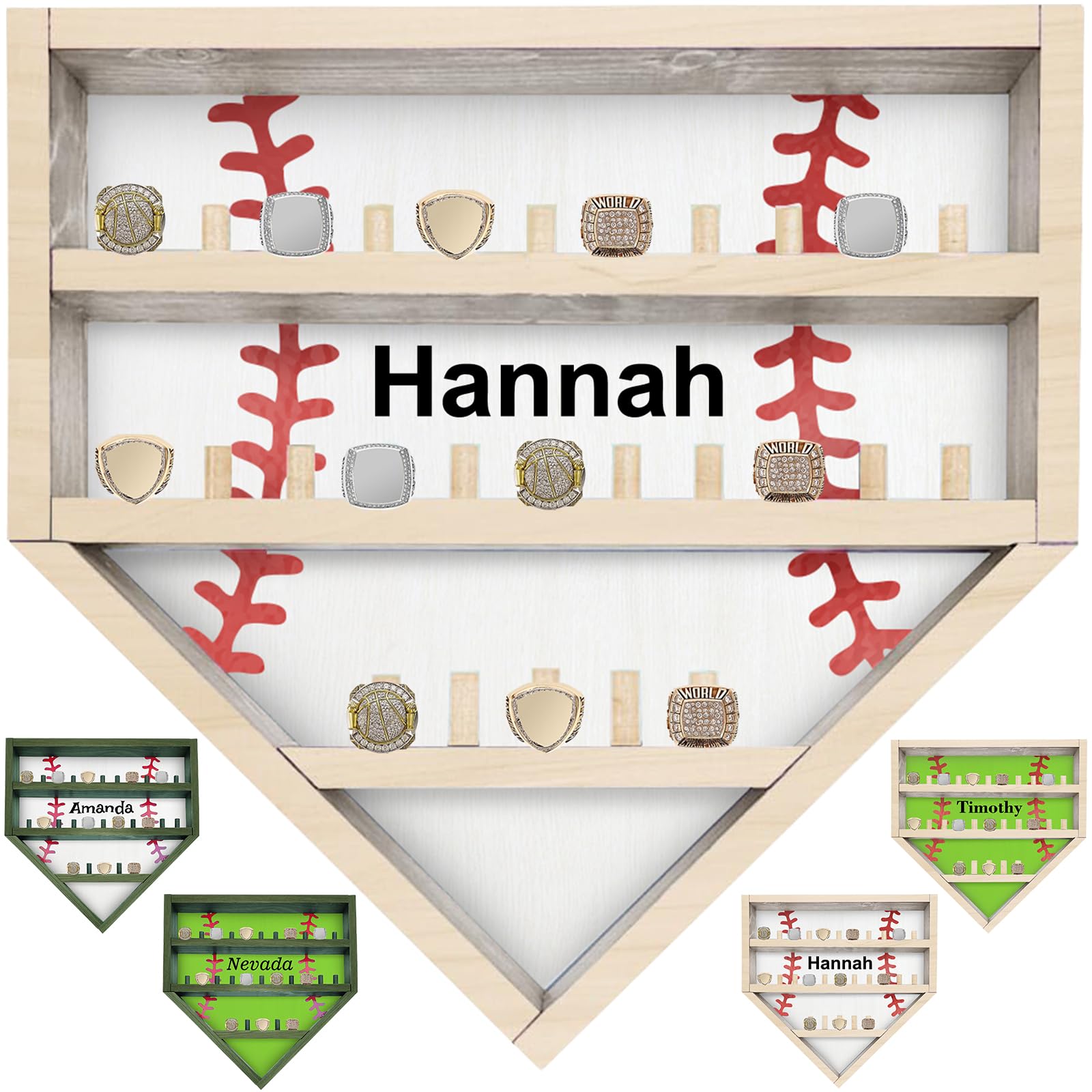 - šMaterial & Size: Personalized Baseball Ring Display Case is made of premium wood. Therefore, the different textures of the frame make each of them unique. The size of the personalized ring display case is 11.8x13.8 inches. This baseball ring display shelf is designed to hold all types of baseball rings, including championship rings and personal achievement rings.