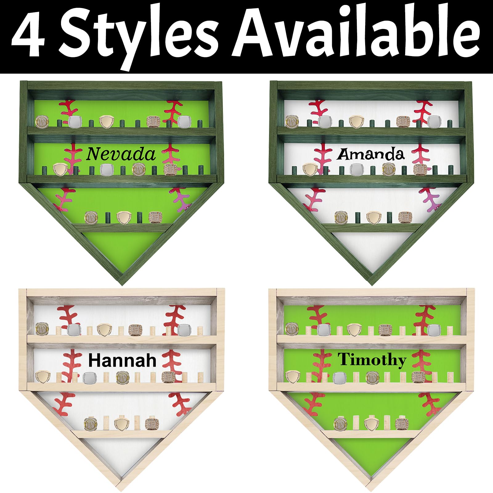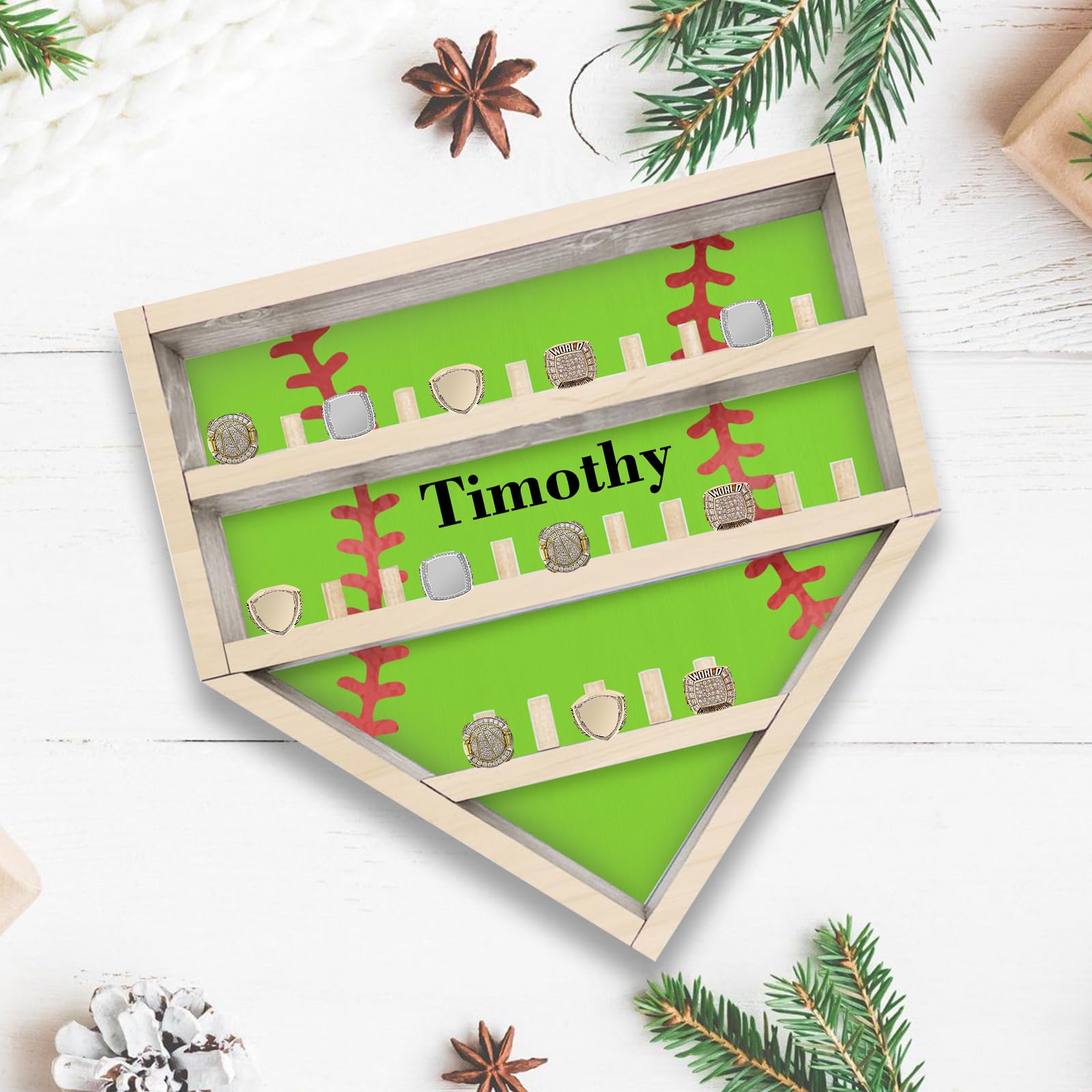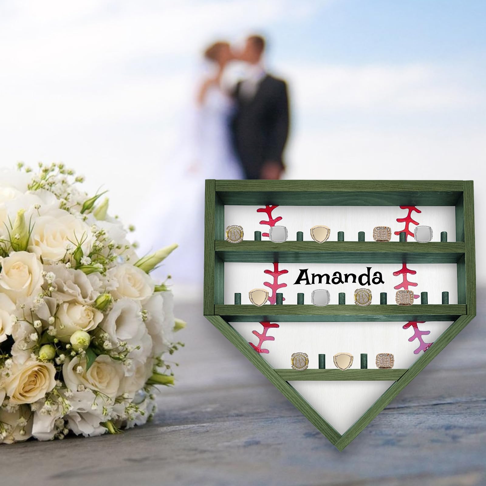 - šMaterial & Size: Personalized Baseball Ring Display Case is made of premium wood. Therefore, the different textures of the frame make each of them unique. The size of the personalized ring display case is 11.8x13.8 inches. This baseball ring display shelf is designed to hold all types of baseball rings, including championship rings and personal achievement rings.