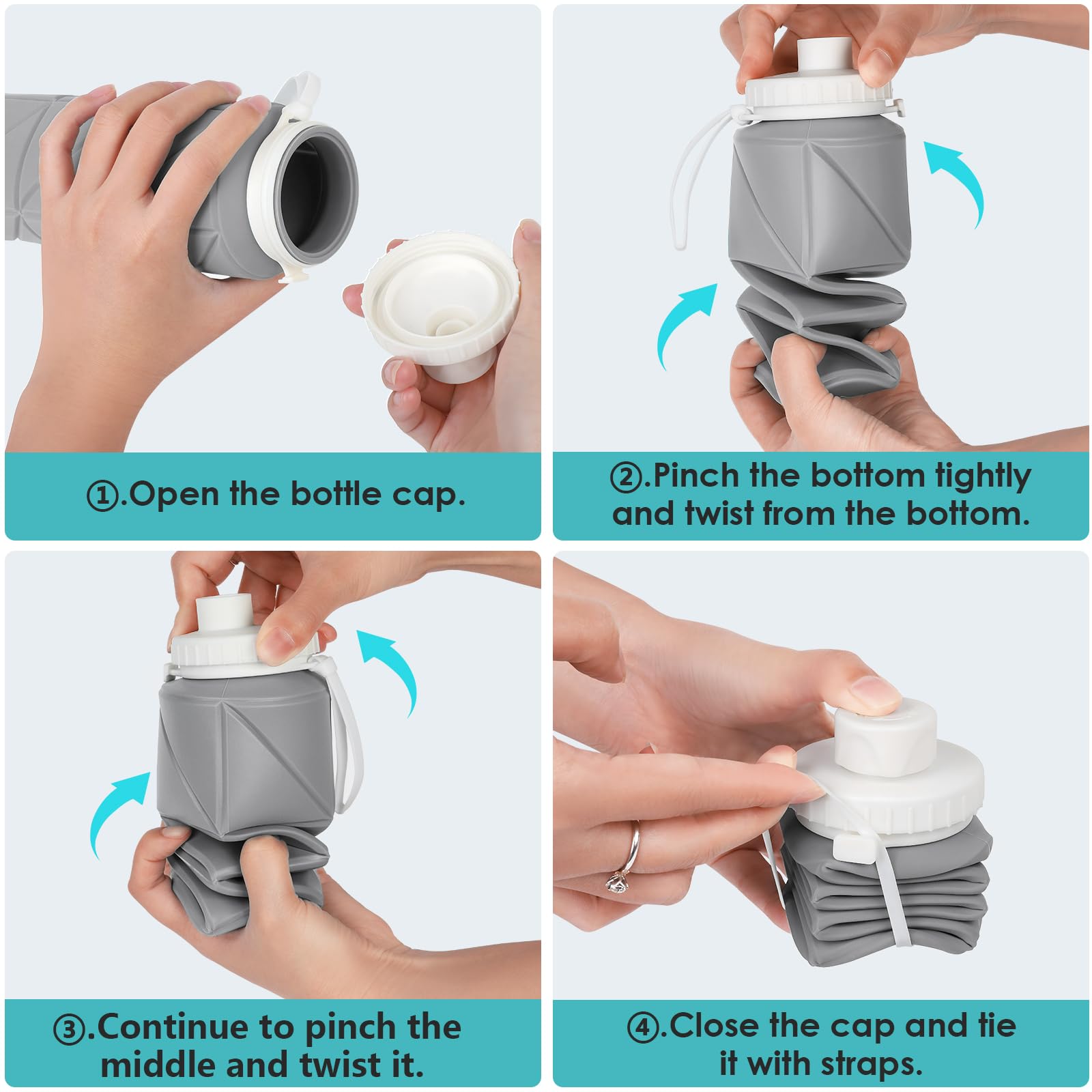- Portable Convenience: Usage steps:1)Open the bottle cap.2)Pinch the bottom tightlyand twist from the bottom.3)Continue to pinch themiddle and twist it.4)Close the cap and tieit with straps.Say goodbye to bulky, rigid water bottles! Our lightweight and compact collapsible water bottle is your brilliant choice. This versatile and reusable companion attaches effortlessly to your backpack or gym bag, keeping hydration within reach. It even fits neatly in your pocket, purse, or pack.
