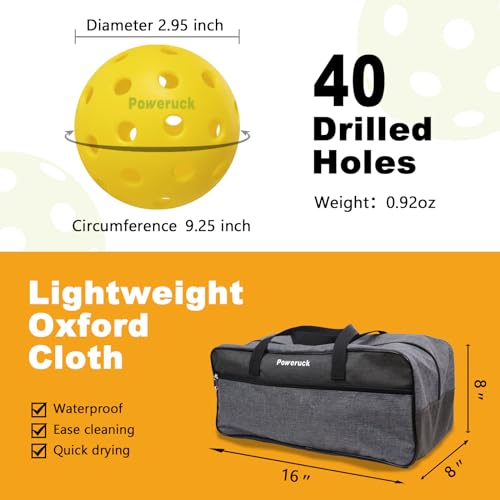 - Excellent Value Pickle-tennis Ball Equipment Set: Poweruck ball retriever comes with 20 extra 40-hole pickleballs that up to USAP standard and a handy quality tote bag carrier for your pickleball practice or tennis court. You can get this pickleball accessory kit for half the usual price.