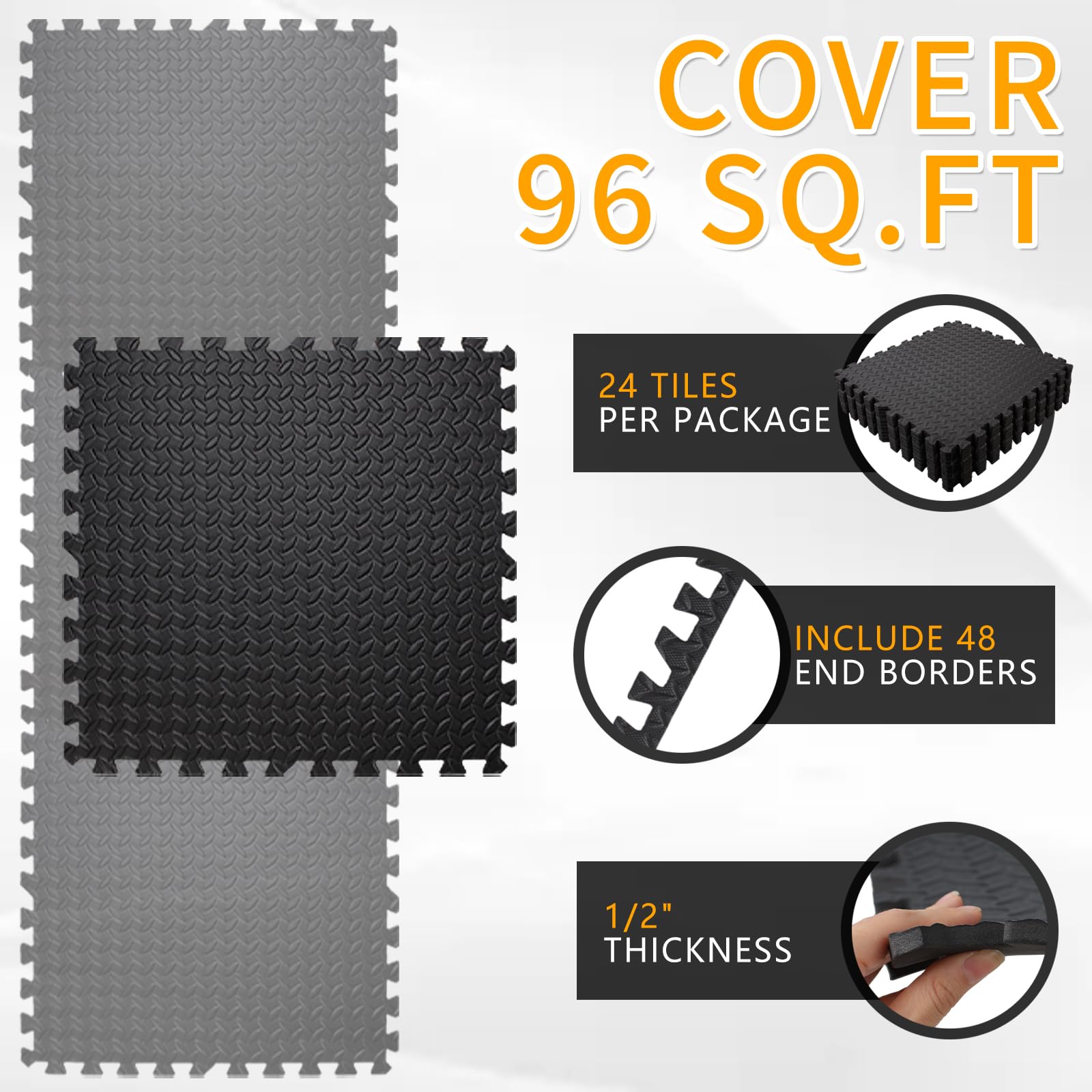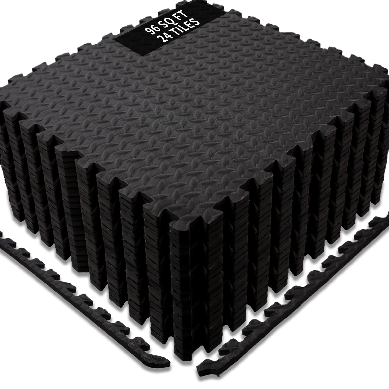 - Covers 96 Sq Ft: Each tile measures 24 in x 24 in x ½ in - thick from the highest point of the texture; Includes 24 tiles with end borders for a polished look. Care: Apply warm water and dish soap with a soft cloth or towel and air dry