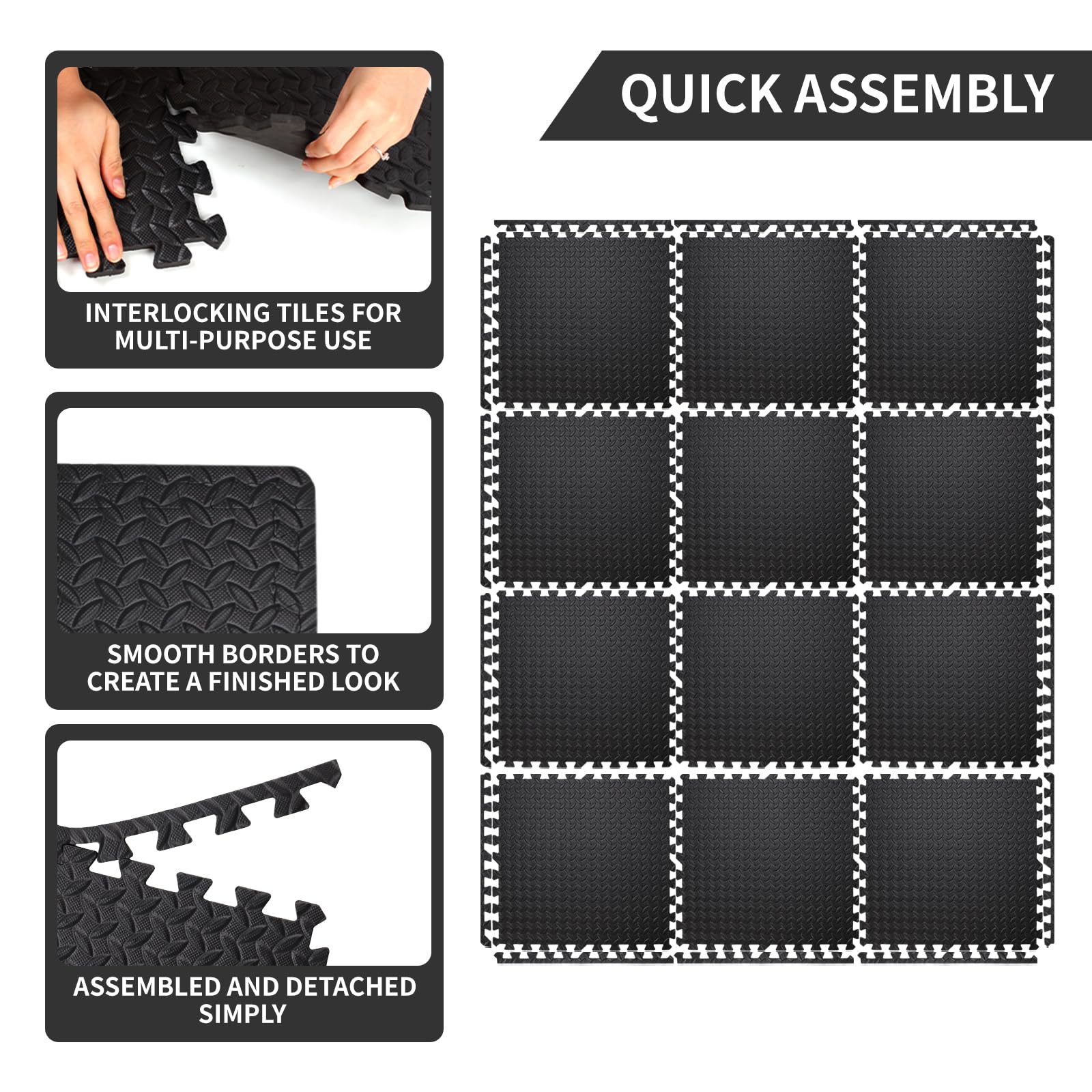 - Easy to Assemble: Lightweight interlocking foam tiles connect quickly and easily, and can be disassembled just as simply for quick storage
