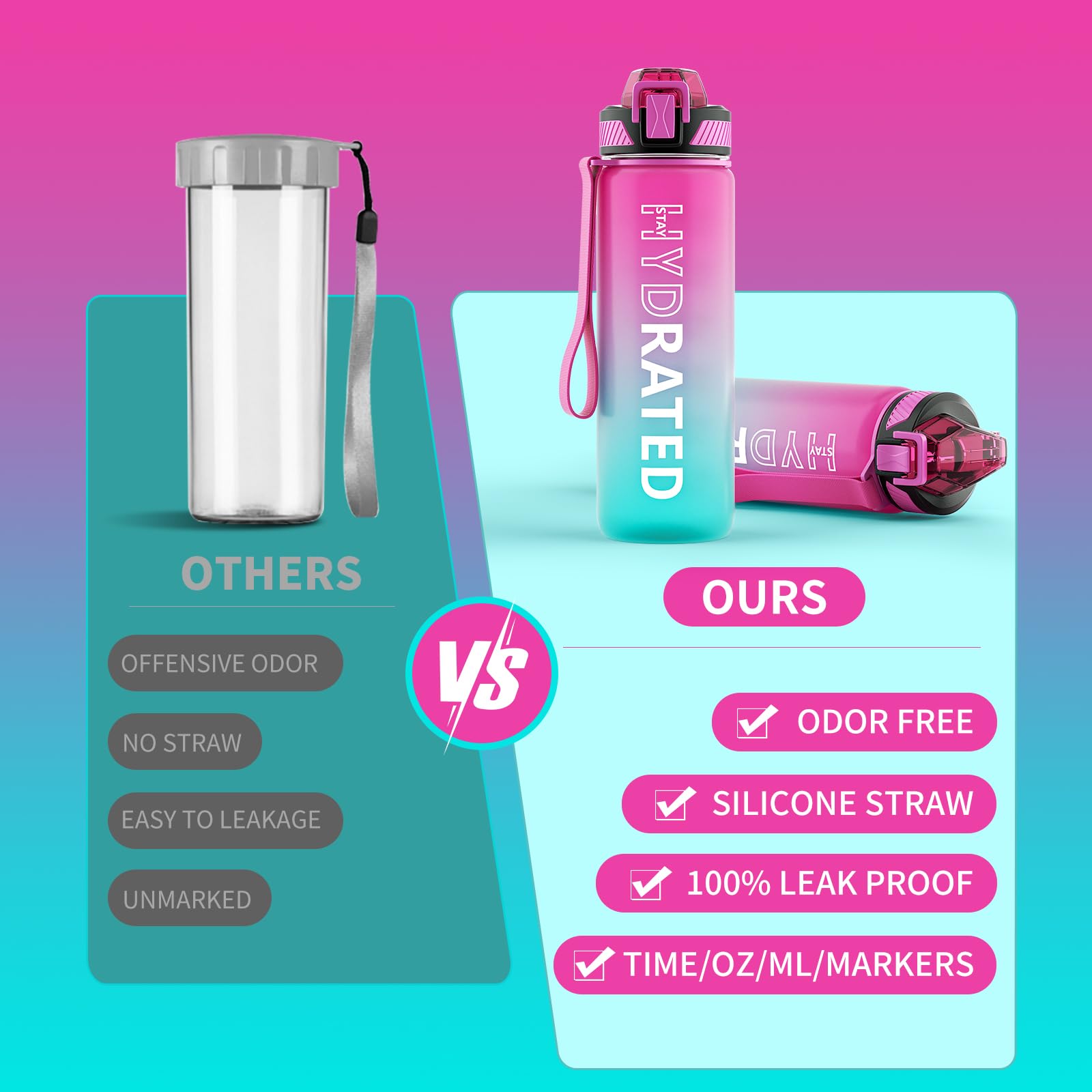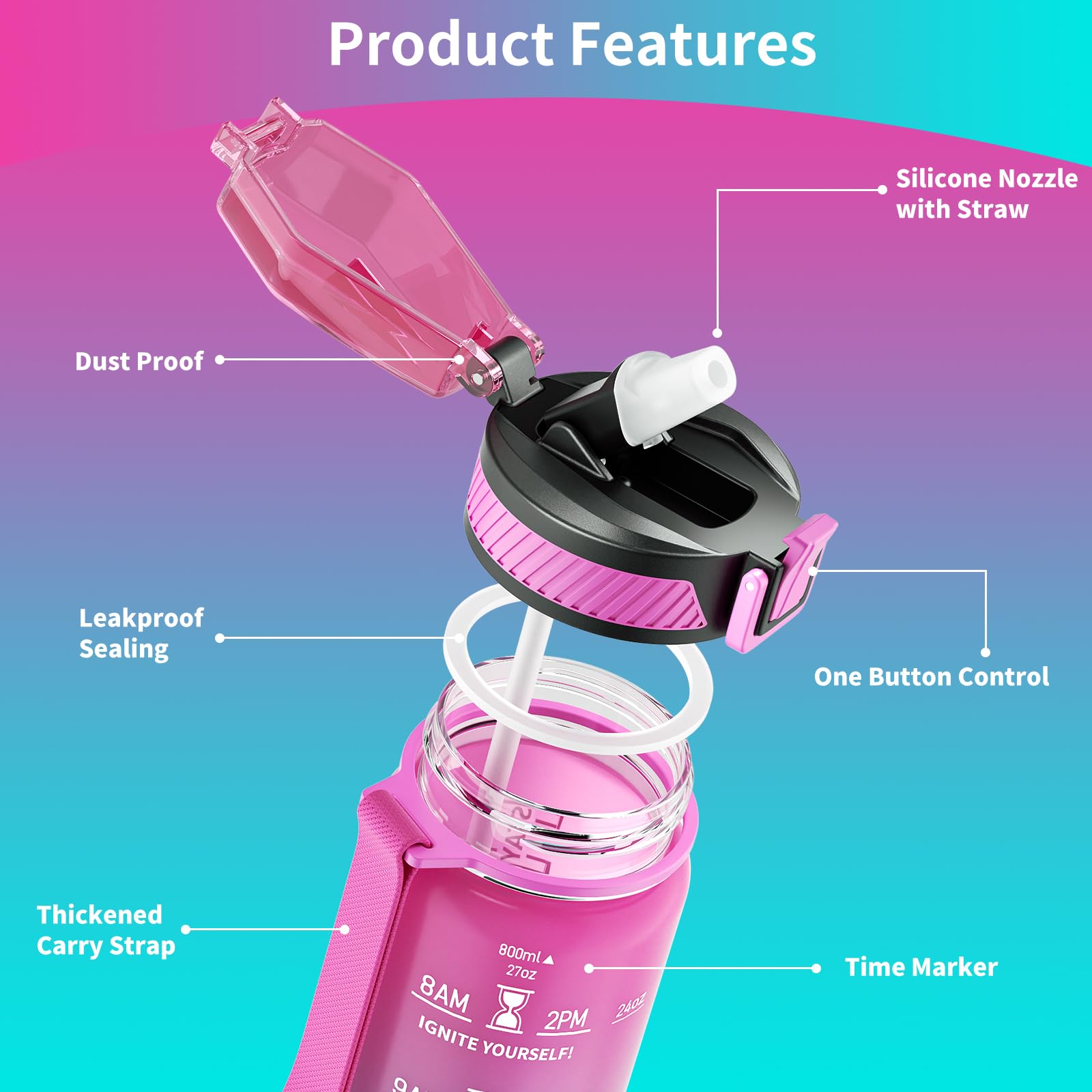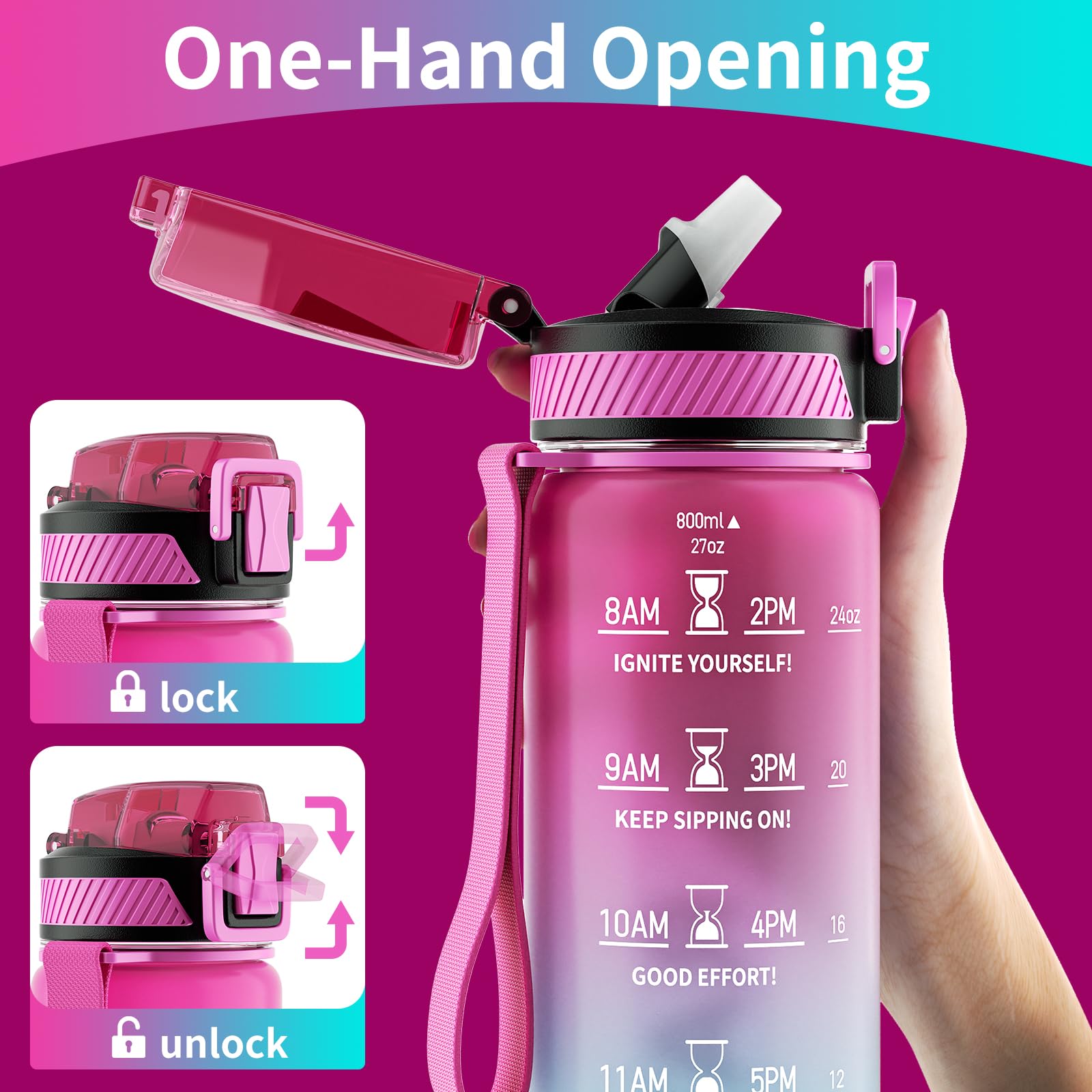 - Easily Open & Leakproof: Our motivational water bottles flip-top lid is designed with a secure lock, which effectively preventing dust and leak-proof. It can be easily opened with one hand. Our sports water bottles for school has a silicone nozzle with a straw inside to prevent turbulent water flow