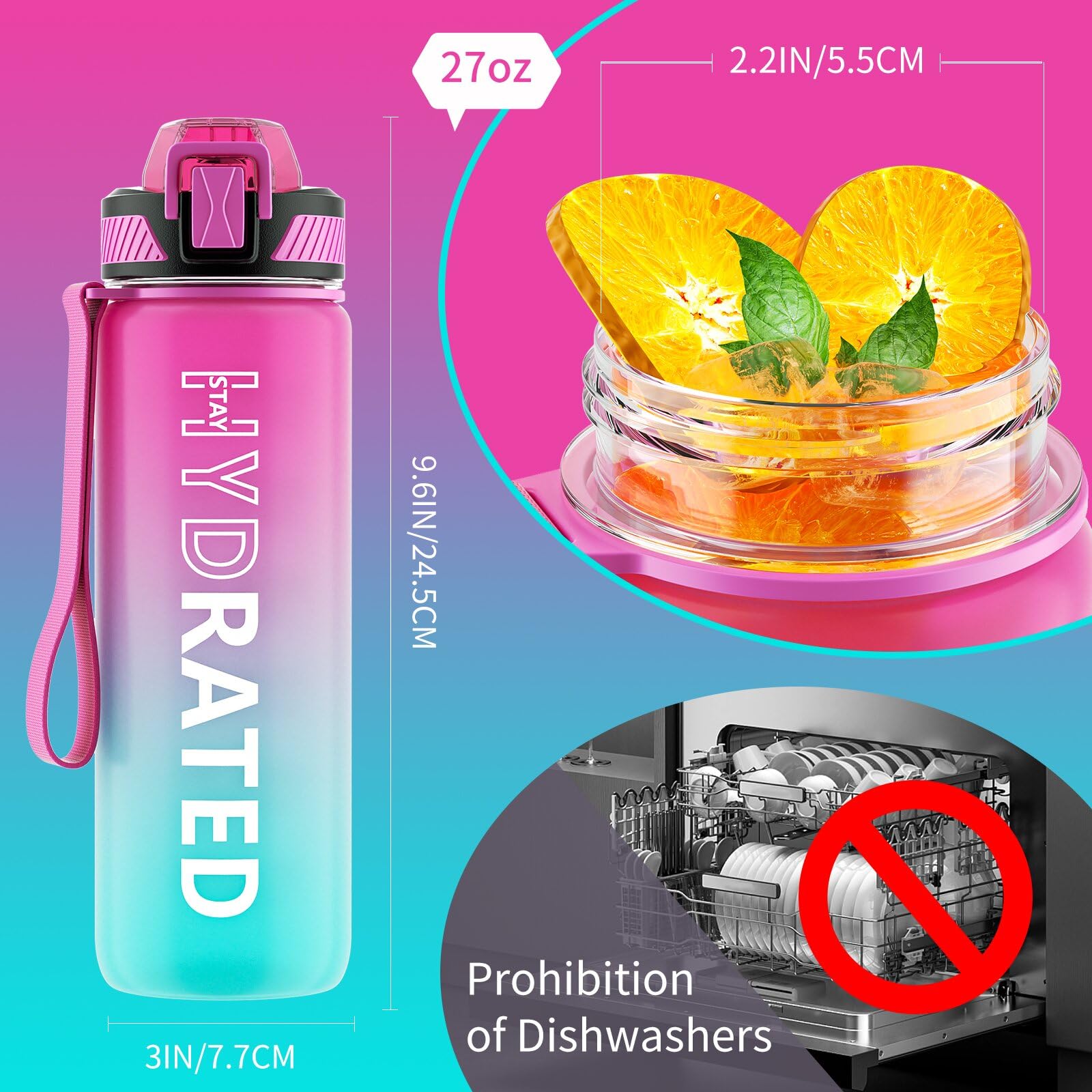 - Portable Fashion Design: Our 27 oz water bottles is equipped with straw and a carry strap. And you also have a variety of colors to choose from. The wide mouth is easy to fit ice cubes and easy to clean . The clean brush coming with the water bottle is also a great cleaning partner