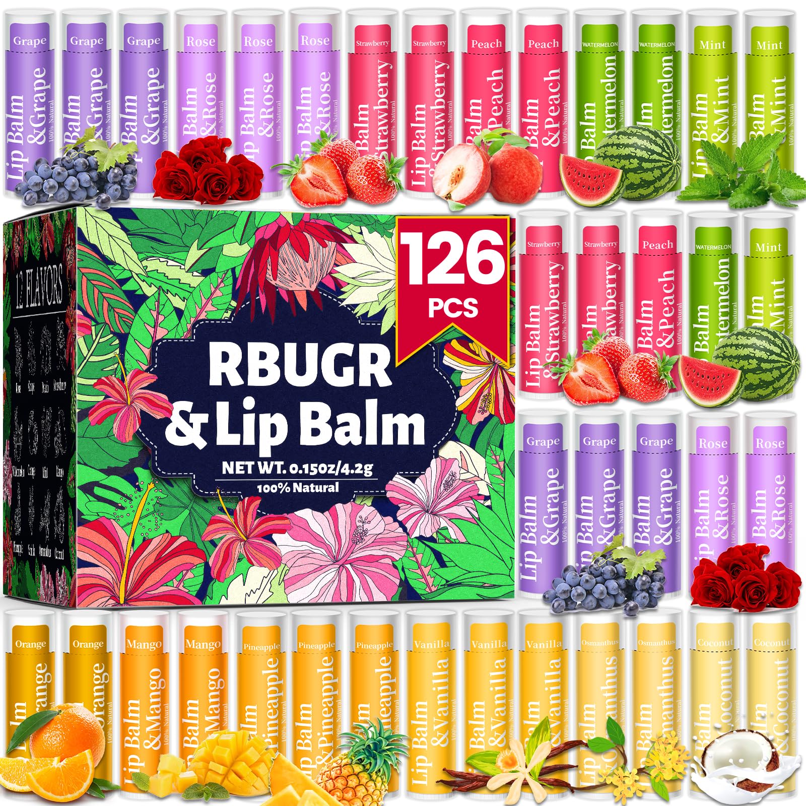 RBUGR 126 Pcs Lip Balm Bulk, 12 Flavored Pack of Lip Balms Pack Natural Moisturising Organic Lip Balm Set for Cracked Lips, Bulk Gifts Stocking Stuffers Party Favors(4.2g/0.15oz)