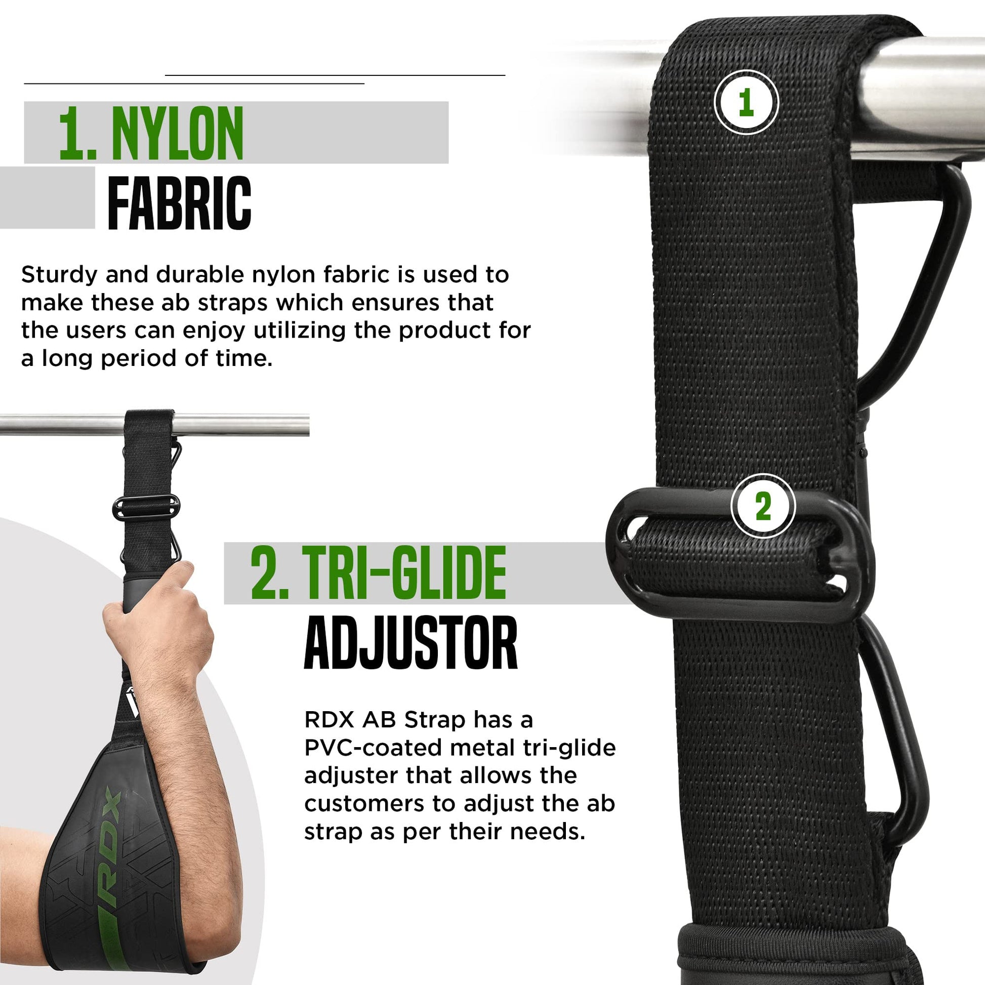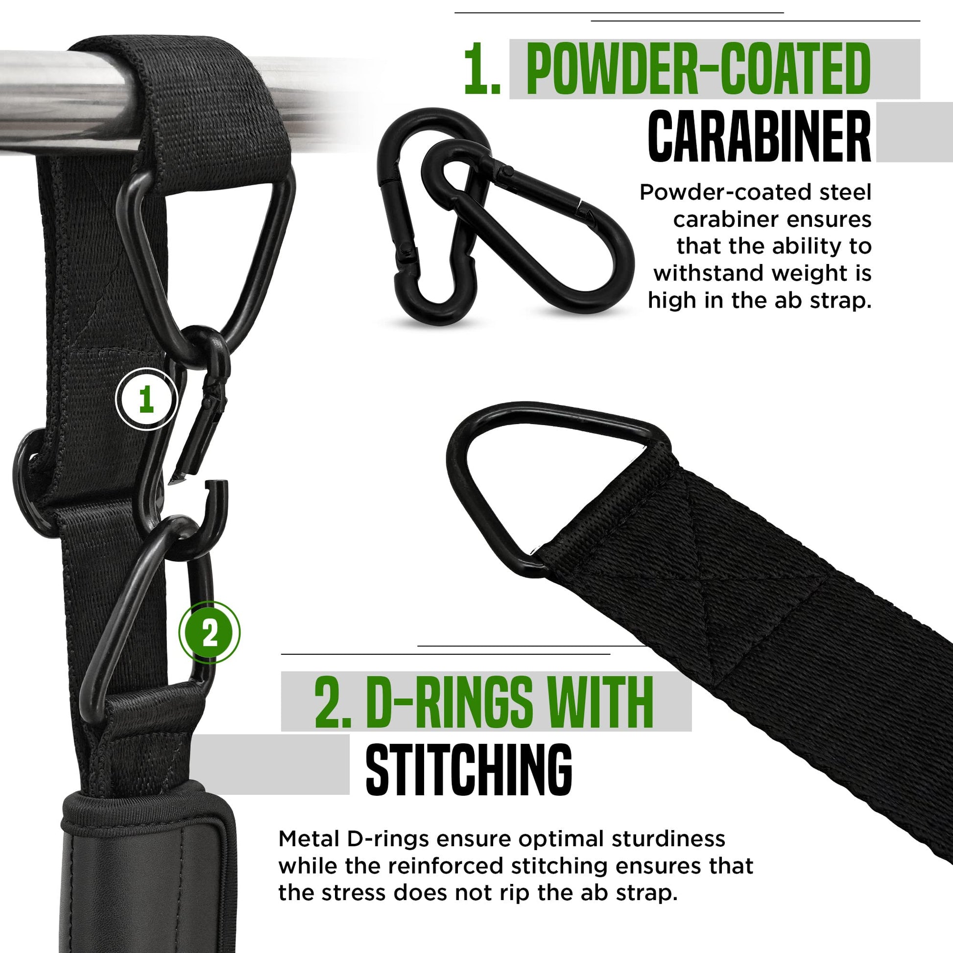 - POWERFUL POWDER-COATED D-RINGS β Engineered for your convenience, the ab lift straps come equipped with double powder-coated D-rings that, together with carabiner clips, prevent slippage and ensure a secure attachment to any bar. This innovative design ensures universal compatibility with various gym setups and equipment. No matter where you train, this ab strap is your reliable workout companion, giving you the freedom to focus on your core and abdominal exercises without limitations.