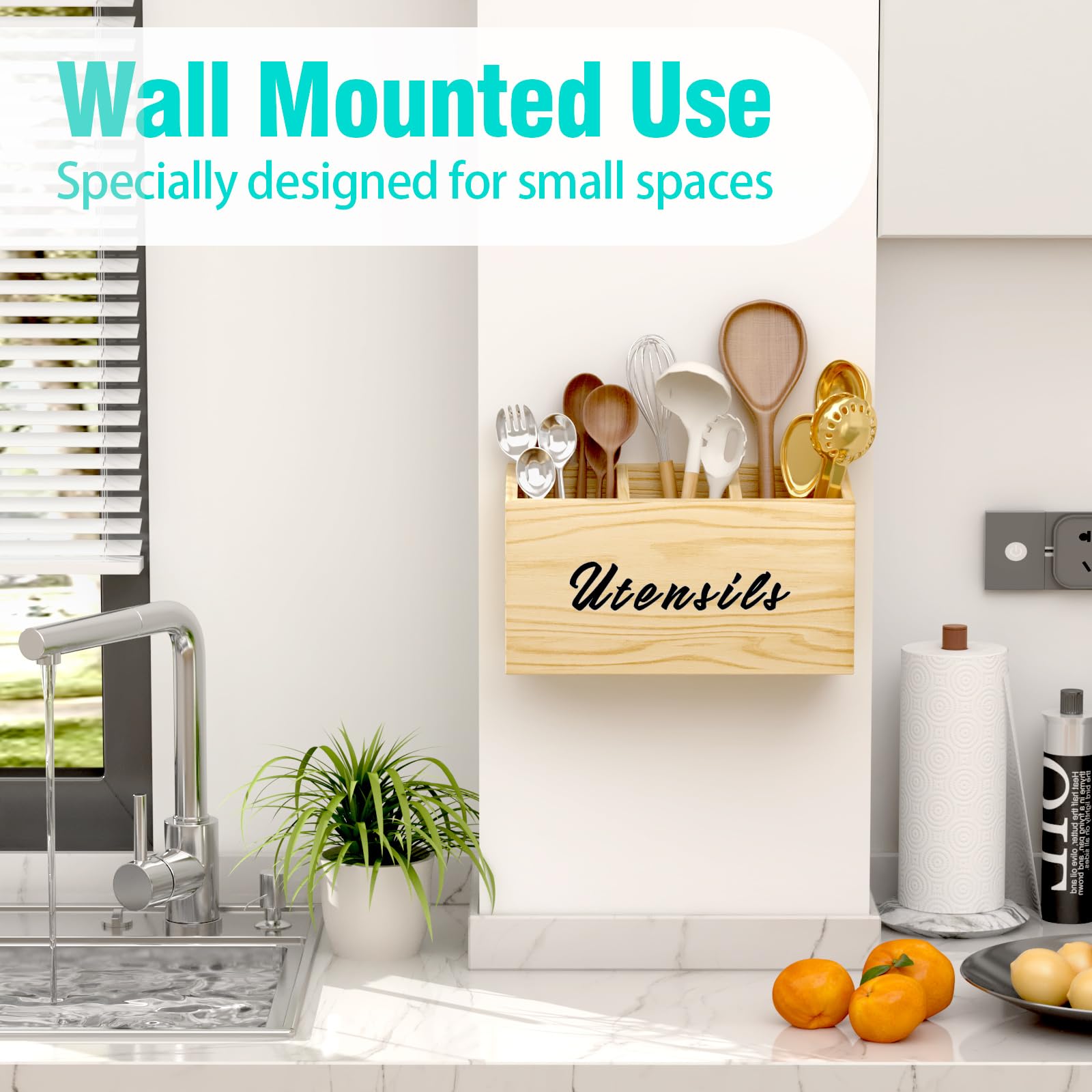 - Kitchen Essential Storage Organizer Box: Our farmhouse Utensil Storage Holder made of premium solid wood is more sturdy and durable, Three compartments are designed for easy storage of various cooking utensils, knives, spatulas, pliers, egg beaters, spoons, skimmers, peelers, bottle openers, silverware, forks, chopsticks, etc., ensuring that your kitchen utensils are neatly arranged. Please note that the packaging does not include any utensils