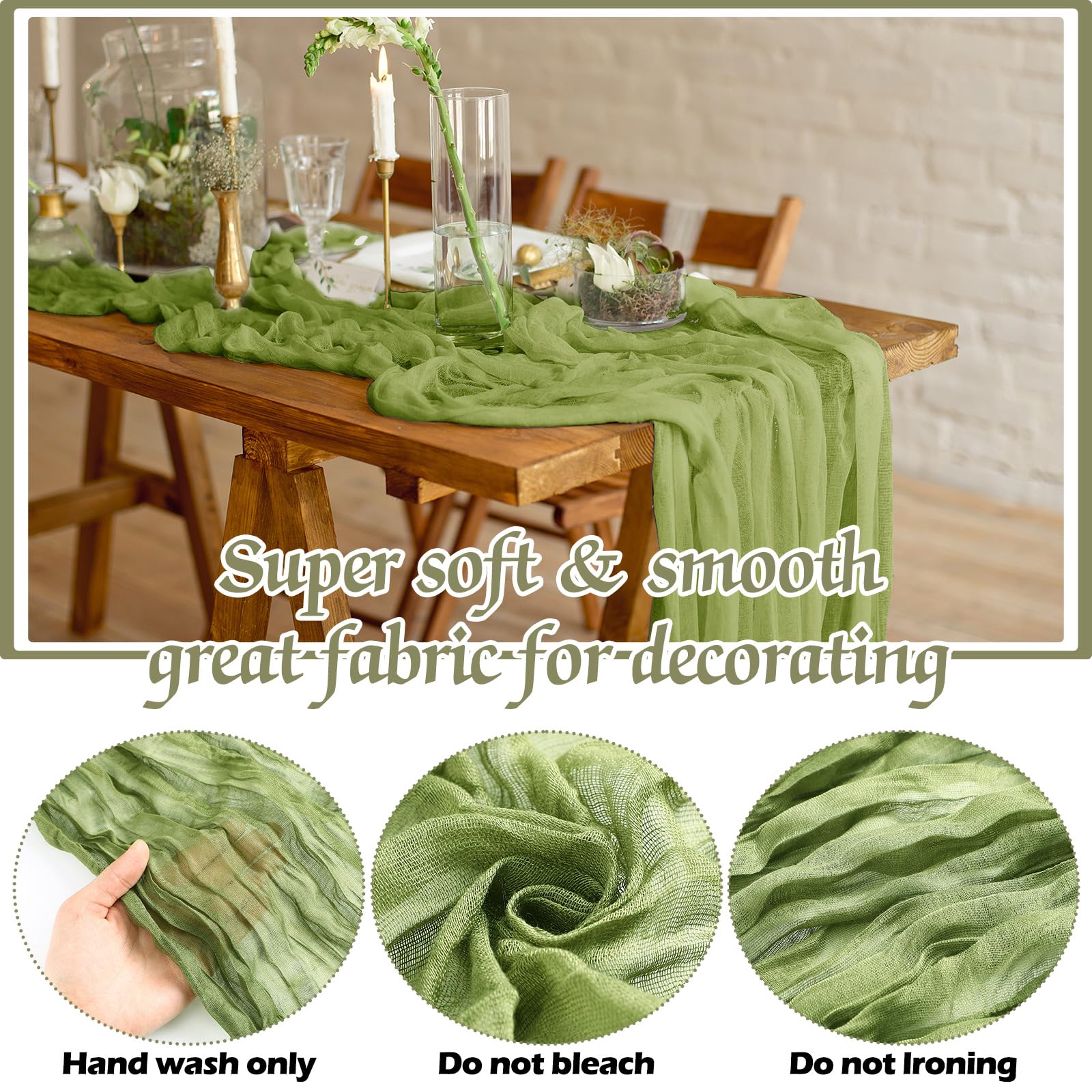 - Suitable for Various Occasions: these sage green cheesecloth table runners are ideal decorations for numerous indoor and outdoor events; Situations like weddings, bridal showers, romantic candlelight dinners, birthday parties, tea parties, cake table decorations, and more, are apt for these runners; The boho sage wedding decor they provide will surely create unforgettable memories for you