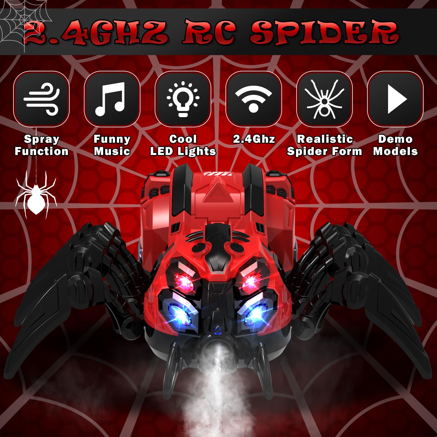 - Spraying Function: By simply adding a few drops of water through the water inlet (included with the set) and pressing the spray button, our remote control spider toy releases a mist from its fangs, looking just like a real spider spitting silk! It will display a red effect in the dark, which is amazing. The rc spider' spraying function offers three different modes, providing a variety of mist frequencies with each press.