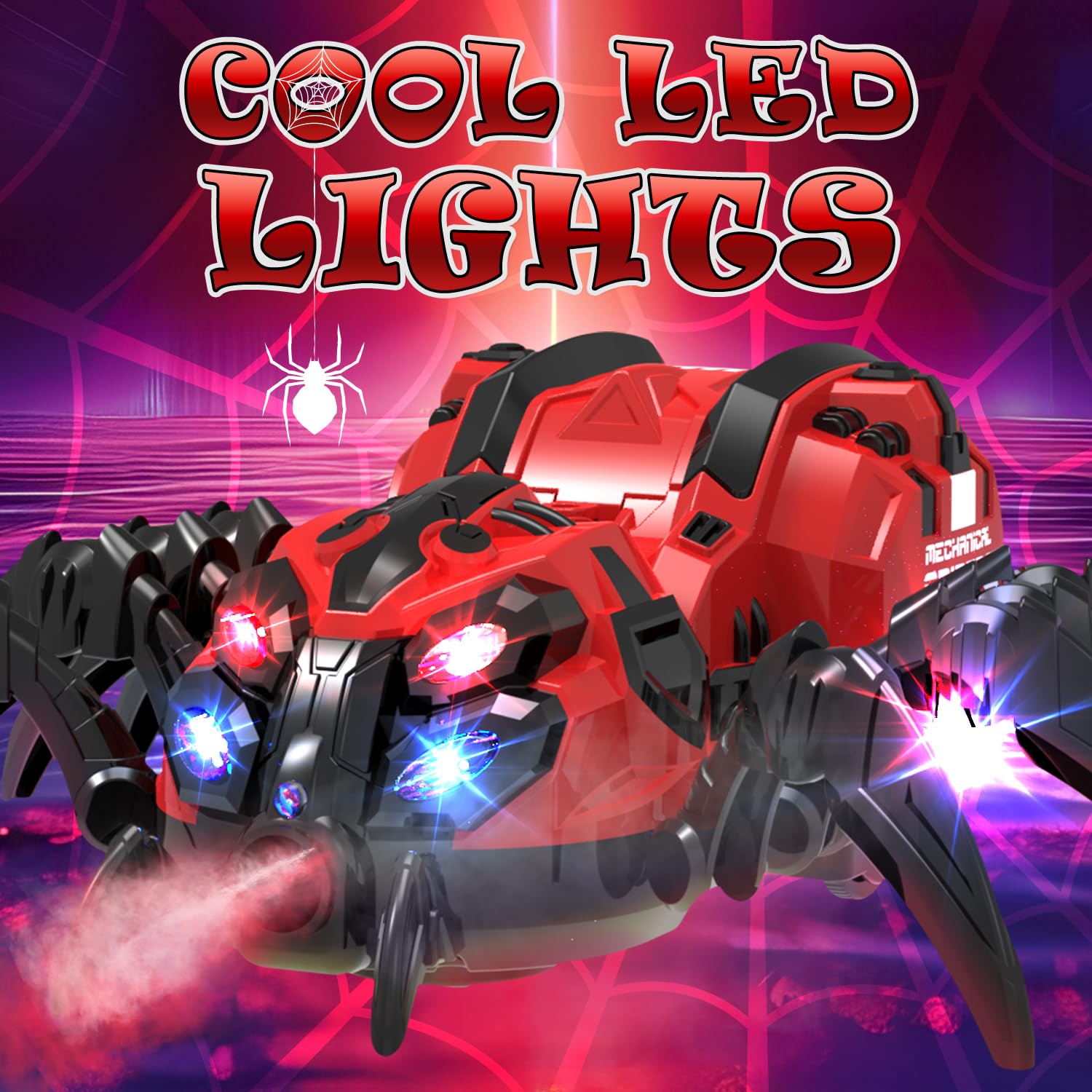 - Cool LED Lighting Effects: The head of the remote control spider toy is equipped with four flashing red and blue lights, while the sides of its body can emit colorful lights. There is also a blue light at the tail. As the remote control spider moves on the ground, the lights scatter around, creating a mesmerizing effect like a robbotspider dancing in a nightclub, it looks very cool.