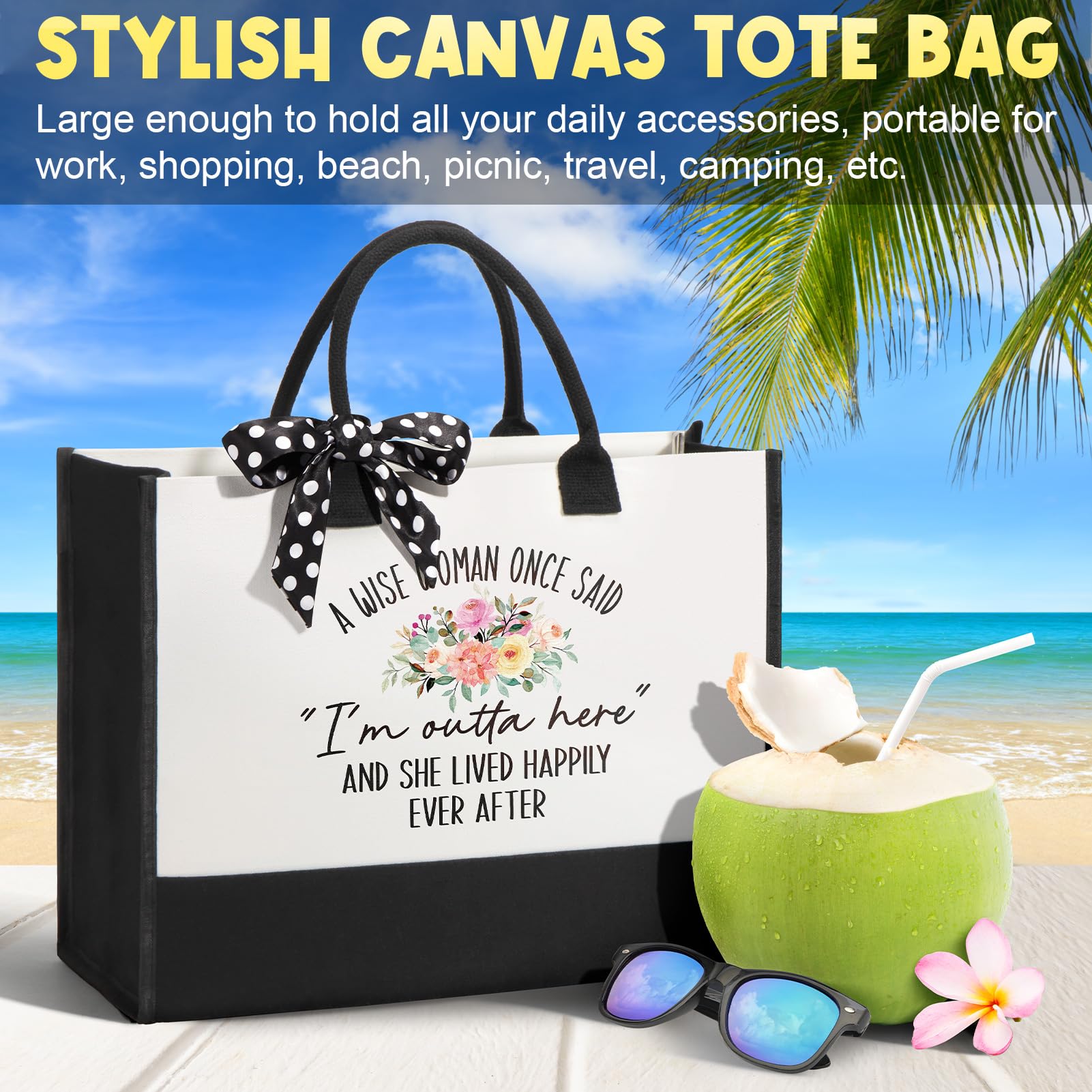 - SYTLISH CANVAS TOTE BAG: MAYICIVO Canvas Beach Bag (17'x 13'x 7' ) is made of high-quality cotton canvas with double stitches, strong, durable, roomy enough to hold all daily essentials. Sturdy & comfort handle makes it portable for work, shopping, travel, beach, picnic, etc. A cute polka dot ribbon is provided as tote bag decor, with exquisite text print showing your best wishes, make her feel spoiled and add style & vibrancy to her dull retired life, definitely a cool retirement gifts box