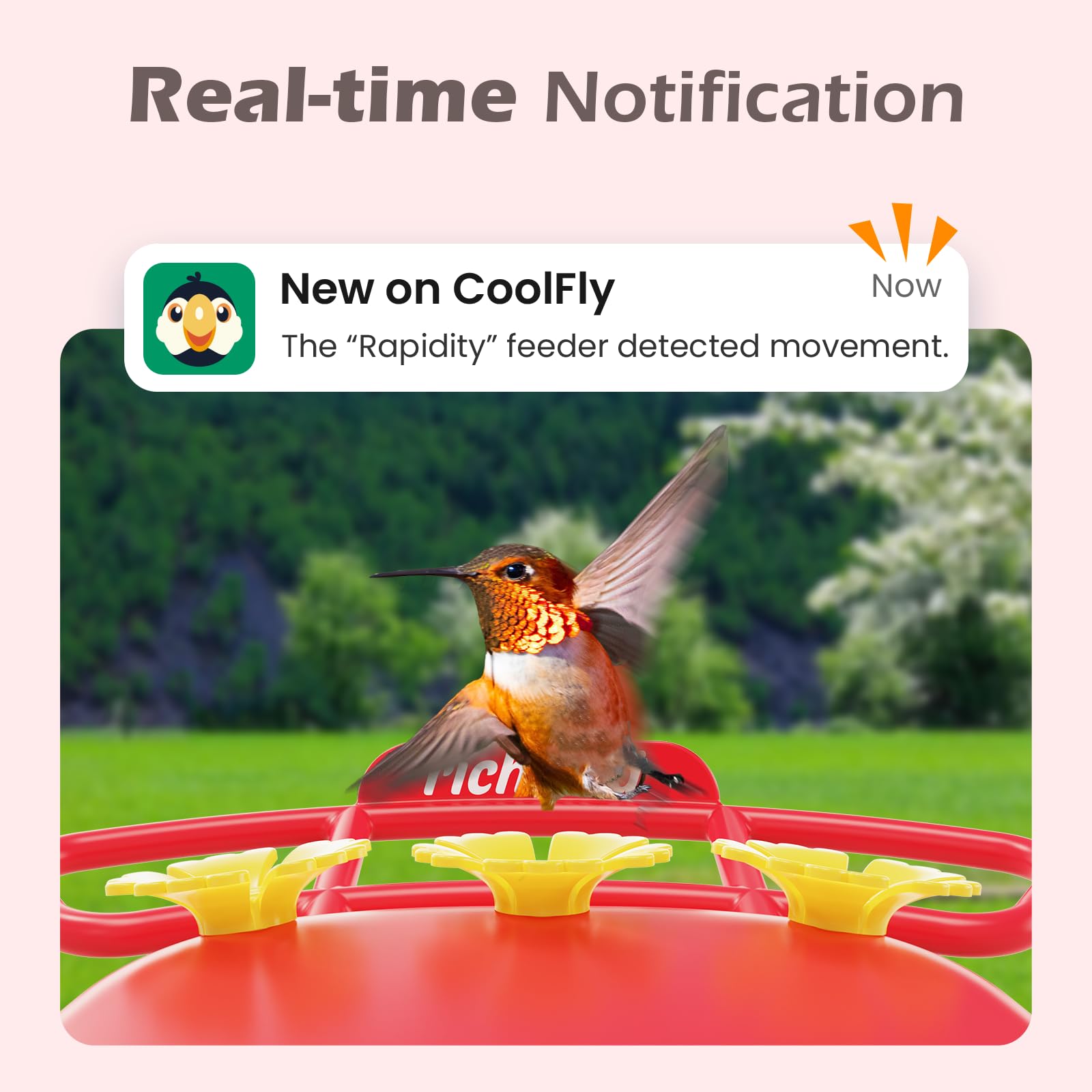 - 【Lifetime Free AI Bird ID】Receive instant alerts when hummingbirds visit your hummingbird feeder camera. Watch, save, and share recorded clips in the CoolFly app. Post your sightings on CoolFly Square to get AI-generated species identification or let the community help identify them. Turn every visit into an interactive learning experience.
