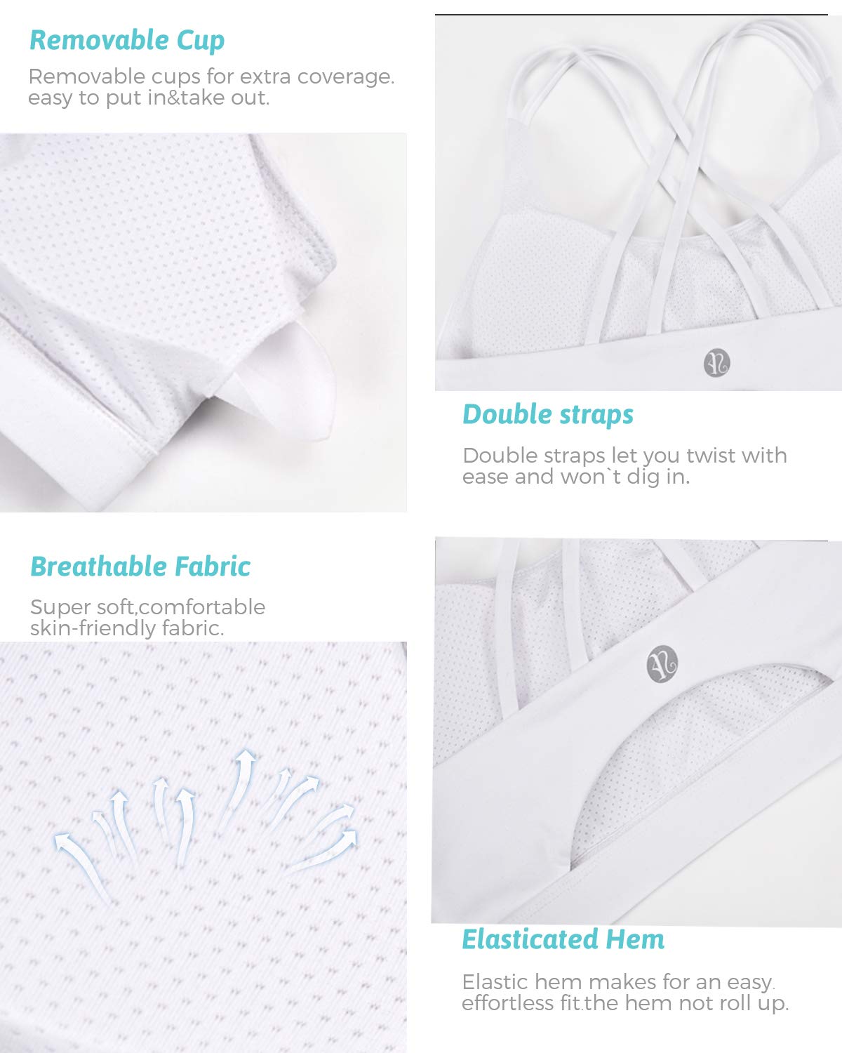 - √YOUR SECURE FIT - Strappy design meets sporty style. Super soft scoop neckline with light, removable pads. Open cutout back styling sports bras for women medium support, widen band underneath the breast ensures a tight secure fit. Removable cups for extra coverage. The removable vertical cotton bra pads are easy to clean.The padded sports bra which always retains its shape and prevent bra bulges, caresses your figure to adjust to your curves.