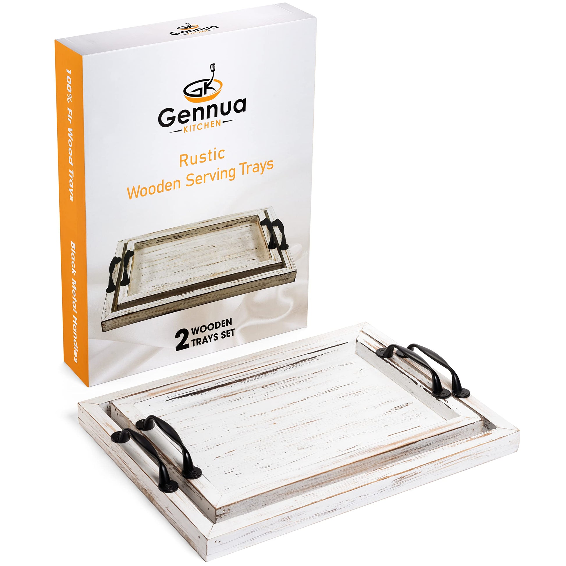 Rustic Serving Tray with Handles - 2 Nesting Trays for Serving Food - Wooden Tray for Decor, Coffee Table & Ottoman - Large Serving Tray with Distressed White Finish to Complement Any Decor