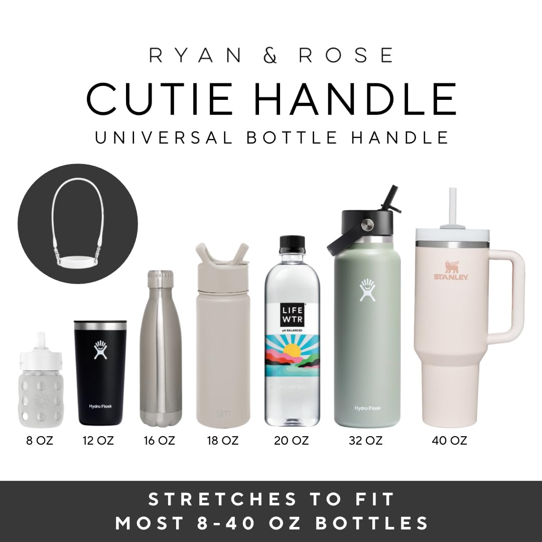 Details: CUTIE HANDLE - UNIVERSAL WATER BOTTLE CARRIER + STRAP + HANDLE The Cutie Handle makes carrying water bottles easy! Made of soft durable silicone, the Cutie Handle is versatile and can be carried in your hand, or can loop/hang on bags, backpacks, strollers, high chairs, wheelchairs, bikes, and more! The clasp handle can be used with or without the bottle strap. Just unclasp from the bottle strap and attach to keys and/or other items that you need to keep close! DIRECTIONS: Simply stretch bottle strap around water bottles, sippy cups, travel mugs and more for an easy carrying method. Stretches to fit most 8-40oz bottles Not all size's guaranteed to fit, Bottle shapes/sizes may vary.