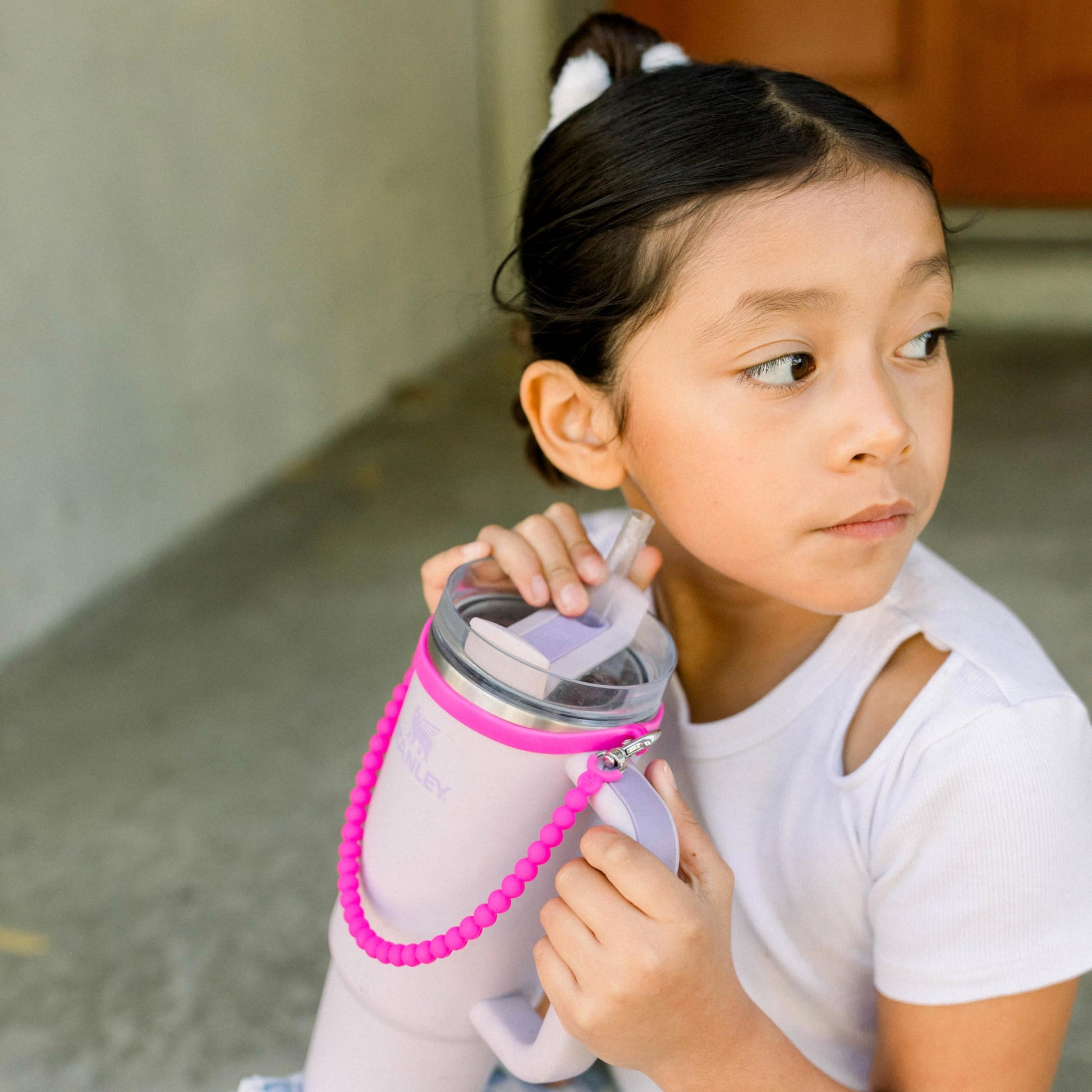 Details: CUTIE HANDLE - UNIVERSAL WATER BOTTLE CARRIER + STRAP + HANDLE The Cutie Handle makes carrying water bottles easy! Made of soft durable silicone, the Cutie Handle is versatile and can be carried in your hand, or can loop/hang on bags, backpacks, strollers, high chairs, wheelchairs, bikes, and more! The clasp handle can be used with or without the bottle strap. Just unclasp from the bottle strap and attach to keys and/or other items that you need to keep close! DIRECTIONS: Simply stretch bottle strap around water bottles, sippy cups, travel mugs and more for an easy carrying method. Stretches to fit most 8-40oz bottles Not all size's guaranteed to fit, Bottle shapes/sizes may vary.
