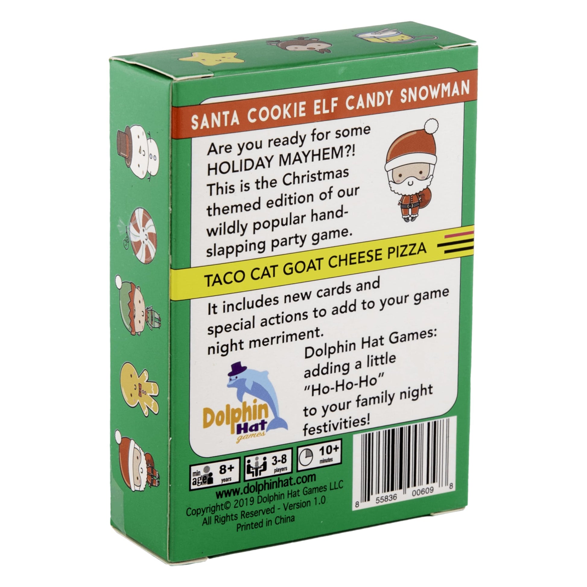 - YOUR FAVORITE GAME, NOW WITH HOLIDAY THEME: Dive into the festive season with this Holiday themed edition of our wildly popular family card game - Taco Cat Goat Cheese Pizza! Instead of saying “Taco, Cat, Goat, Cheese, or Pizza” you say “Santa, Cookie, Elf, Candy, Snowman!” Also, the three special action cards are different which provide a sprinkle of holiday cheer!