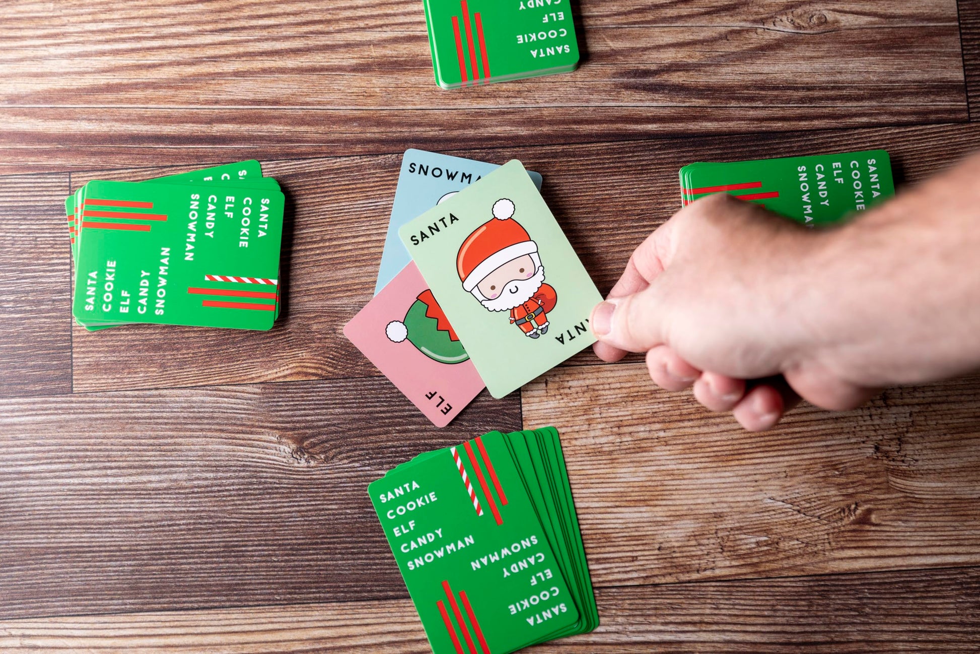 Details: Santa Cookie Elf Candy Snowman is the Christmas themed edition of our wildly popular part game Taco Cat Goat Cheese Pizza!
