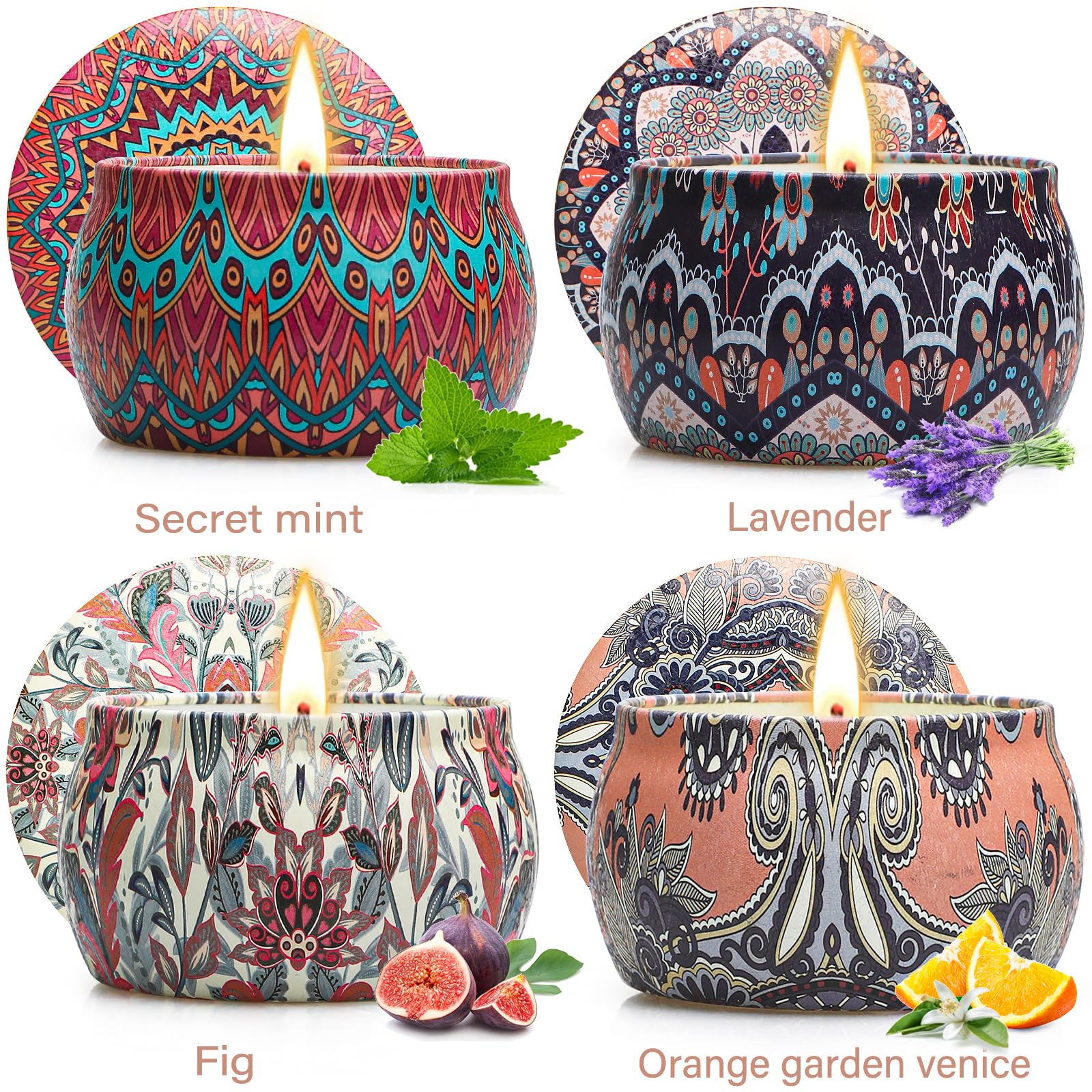 - Scented Candles Set 4 Natural Fragrances-Secret mint, Lavender, Orange garden venice, Fig. Aromatherapy candles with different scents bring you different aromatherapy experiences.