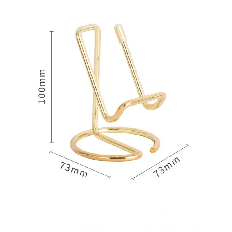 This simple metal phone holder stand is a durable and convenient way to keep your phone upright. With its sturdy metal construction, it provides a secure and reliable way to hold your device. Keep your hands free and your phone easily accessible with this functional and sleek accessory.