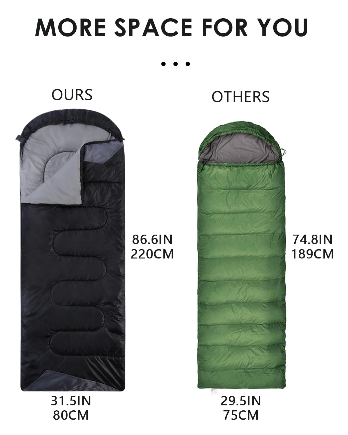 - PLENTY OF ROOM. Comfortably fits most campers up to 5 FEET, 11 INCH tall. SEZE: 31.5 by 86.6 inches (W x D). Our sleeping bag can be used in 3 seasons with a design temperature of 32β- 50β(0β-10β). COMPACT DESIGN. Pack Weight is 4.4lbs, the compressed packing size is 9''-14'' and would take up less space