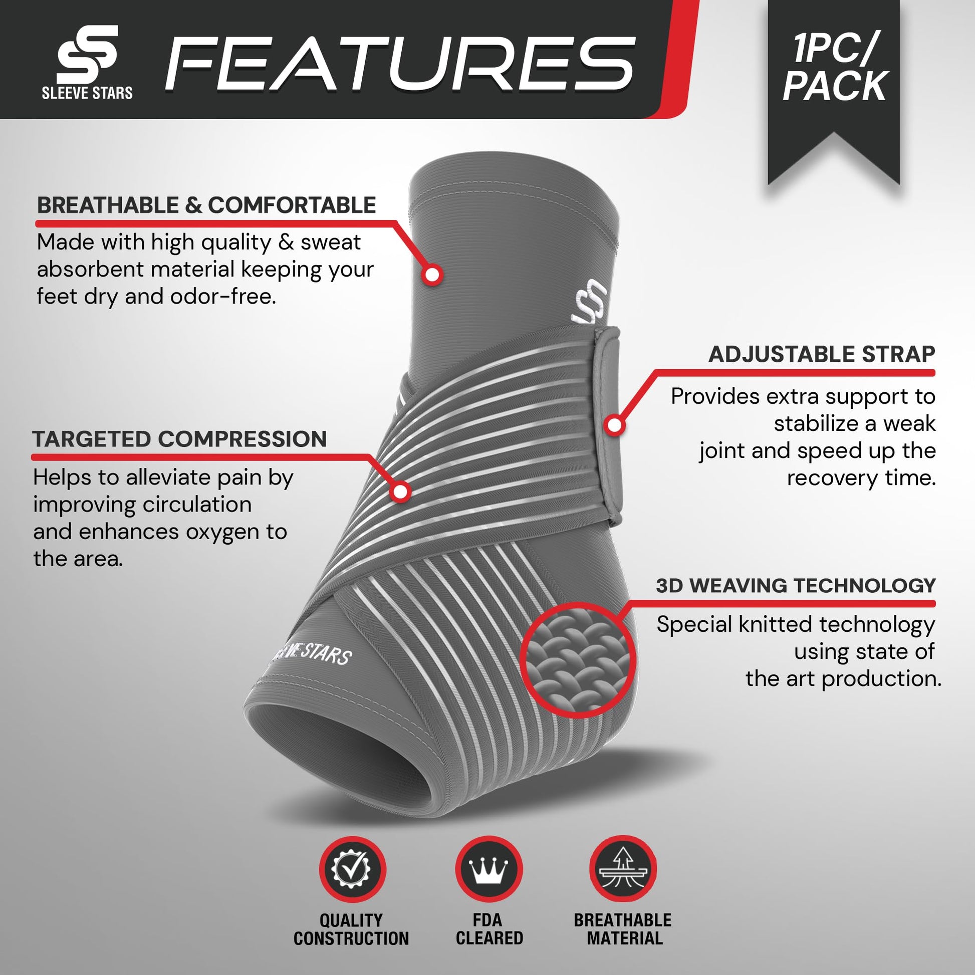 Sleeve Stars Ankle Brace for Sprained Ankle, Plantar Fasciitis Relief Achilles Tendonitis Brace, Ankle Support for Women & Men with Strap, Heel Protector Wrap for Pain & Compression (Single/Gray)