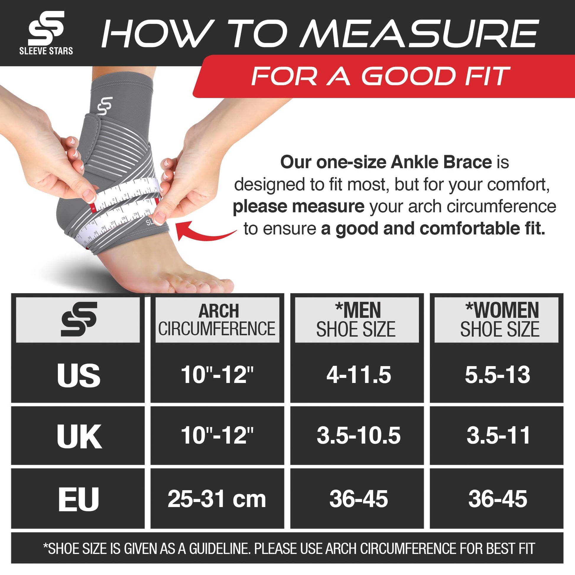 - β Discover your ideal fit!: Our ankle compression sleeve is designed to be versatile, but not every foot is the same. Consult our product images for precise measurements. Shoe sizes are a helpful reference, but measuring your arch circumference guarantees a tailored fit.
