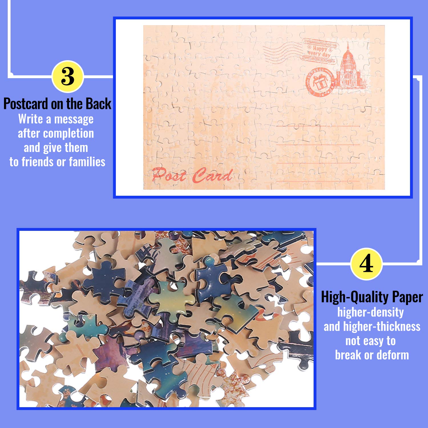 - 【PERFECT AS A GIFT OR DECORATION】: Postcard design on the back.You can write a message after completion.Puzzles are a fun activity to do alone or in a group and it can also be used as a toy or as a gift(Birthday, Graduation, Easter, Thanksgiving, Valentine's day, Halloween, Christmas, New Year day and other events etc.),1x mini Easel included,You can easily turn one of them into a home decoration.
