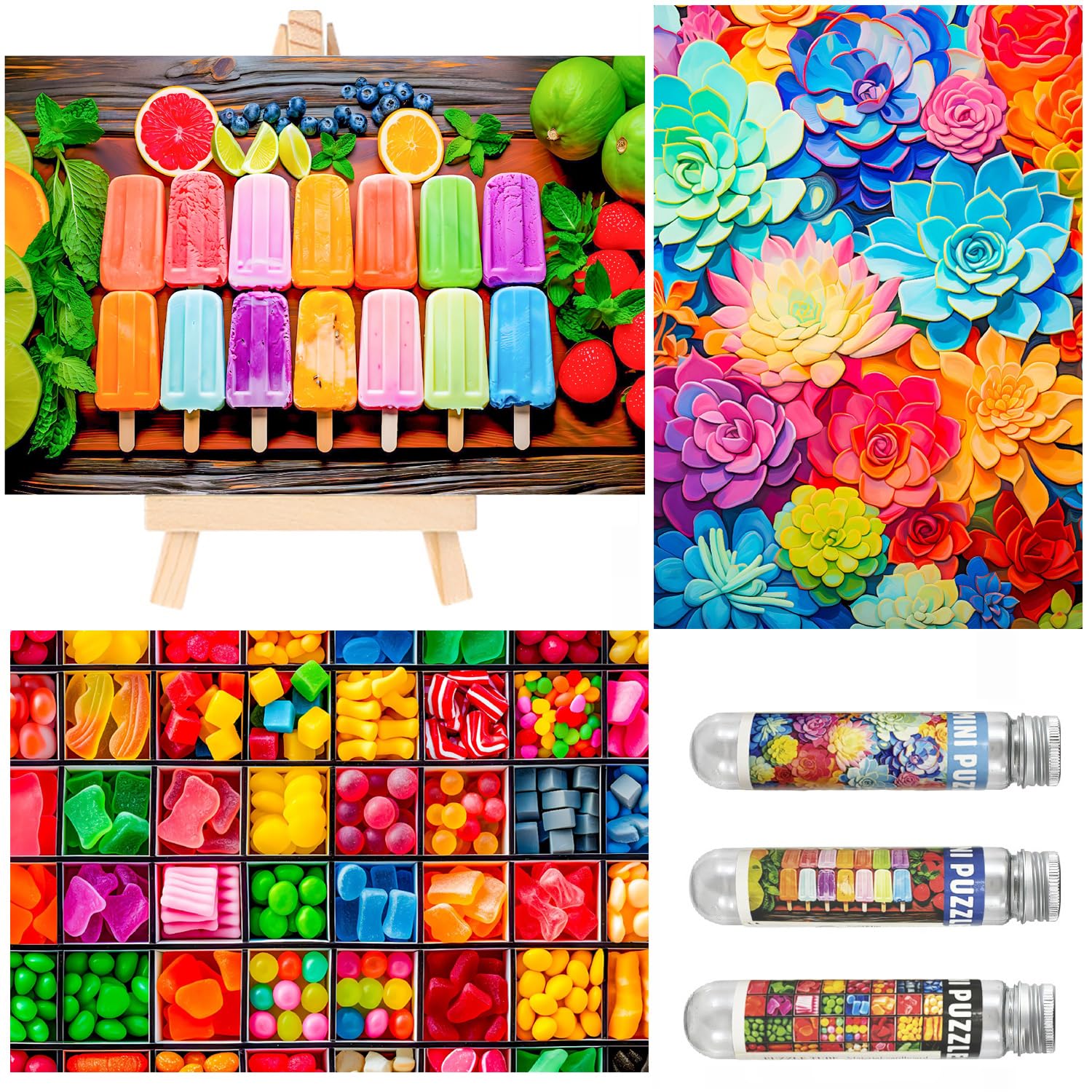 Small Jigsaw Puzzles for Adults 150 Pieces Colorful Candy Ice Pop Succulent Mini Jigsaw Puzzles Challenging Mini Puzzles Tiny Jigsaw Puzzles 6 x 4 Inches, 3 Pcs,Mini Easel Included