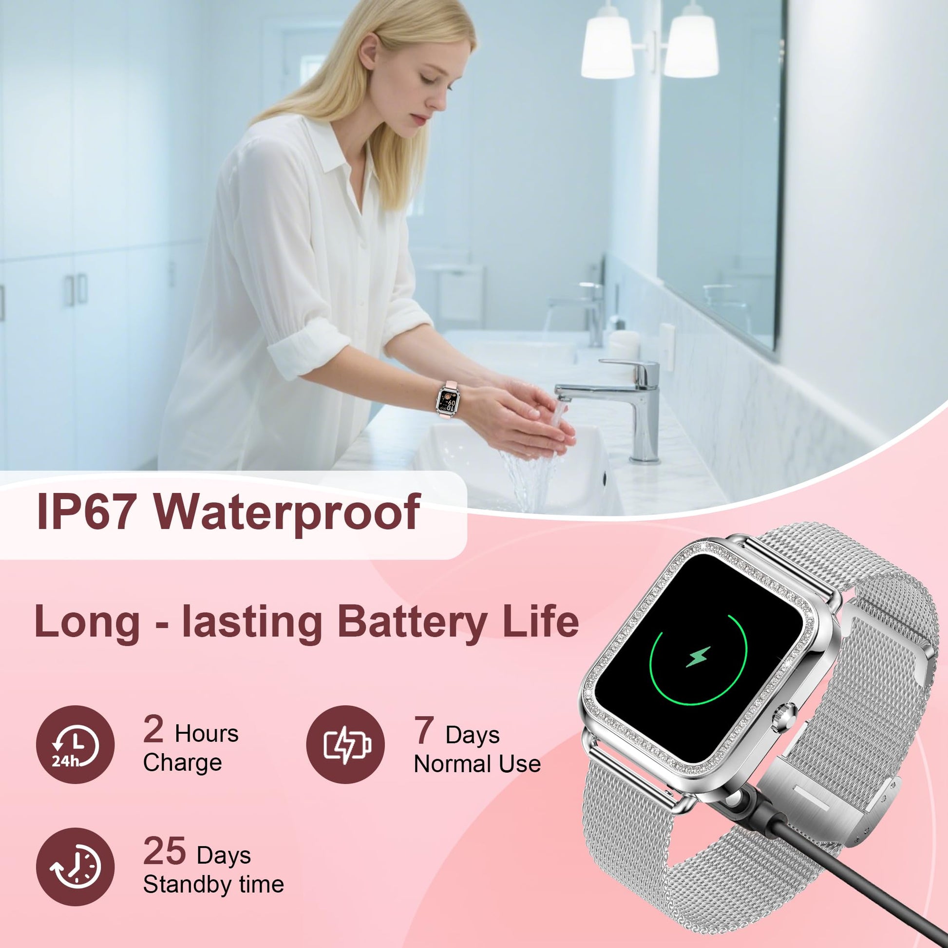 - 【Waterproof and Warm Multifunction】IP67 waterproof, no need to take off the waterproof watch when washing hands, meeting daily waterproof requirements. There are weather forecast, drinking water & sedentary reminders, music & camera control, find phone, women's menstrual cycle, etc. All-round care for you. 2.5h USB magnetic fast charge, 3-7 Days long battery life (Different usage habits, different usage time).