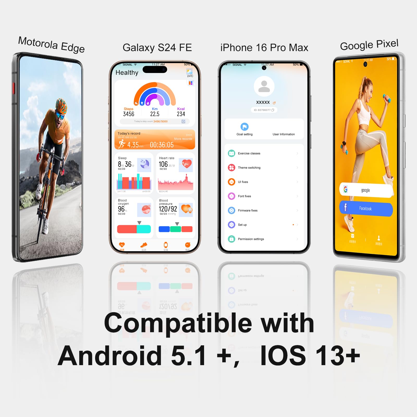 - 5.【Bluetooth 5.3 Easy Connection】The smart watch is compatible for iPhone and android phones, connecteds by Bluetooth 5.3, it ensures fast, stable, and low-latency connections.